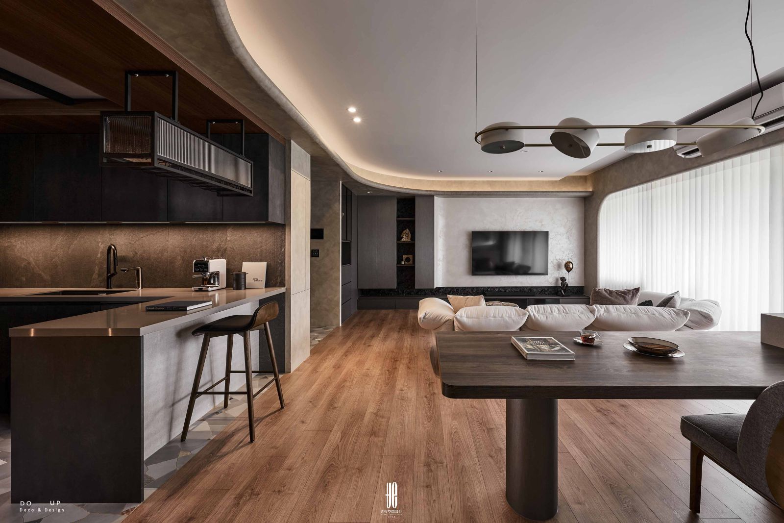 墨染幽居,弧度與紋理交織,圓弧線條暈染全室
