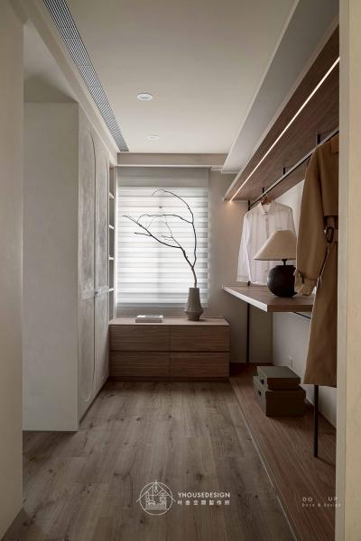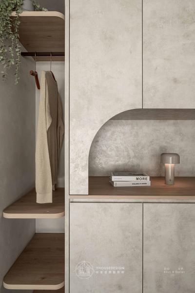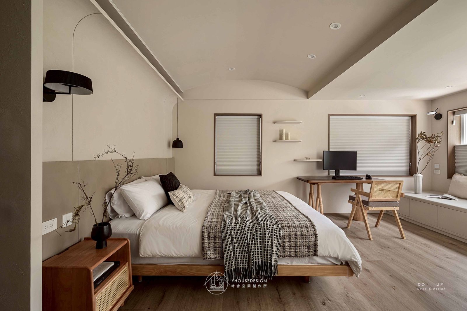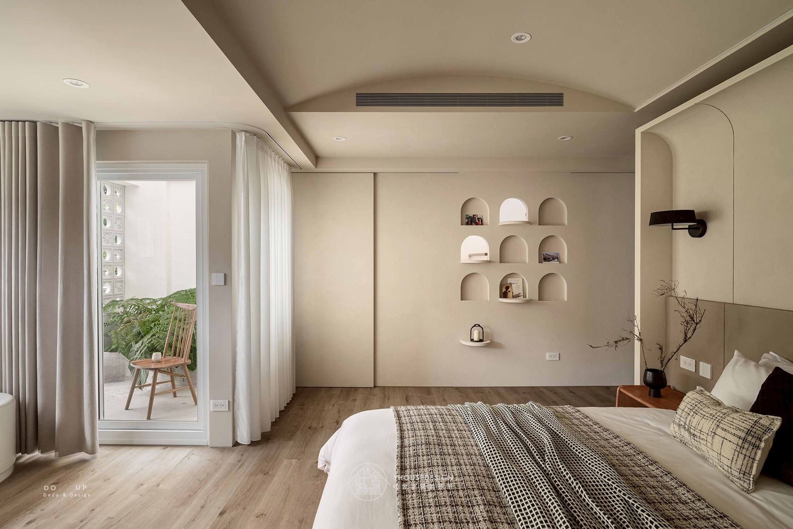 主臥室最引人注目的設計靈魂,莫過於牆面上那座拱形幾何壁龕櫃。設計師以手感的奶油色塗料,在牆面上挖鑿出如小島岩洞般的陳列空間,不僅打破了平面的單調,更為私領域注入了濃厚的藝術氣息。