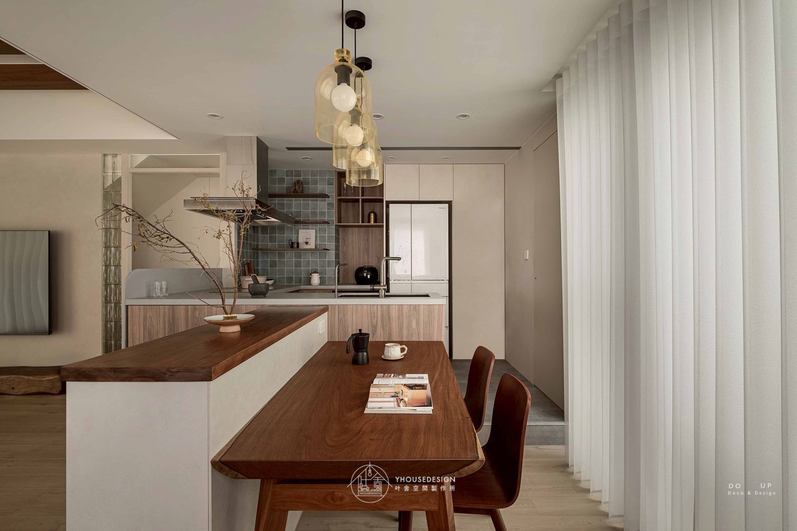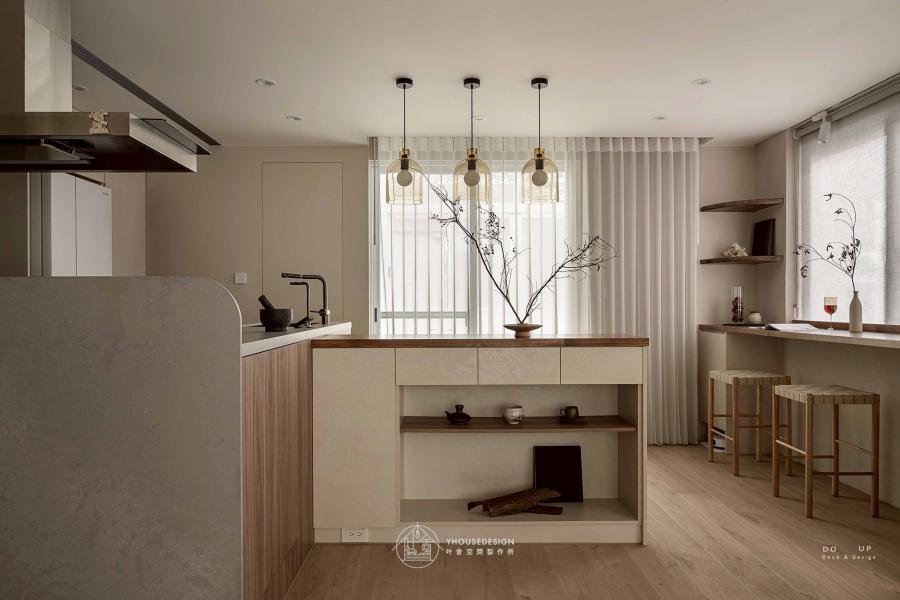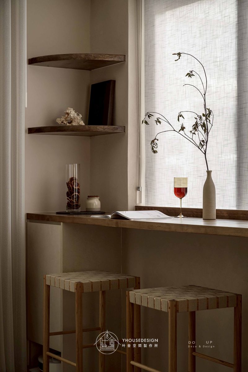 吧台以帶有手感的奶油色塗料結合溫潤的木質收邊,與天花板的木樑交相輝映,讓「霧氣感」的質地在此處疊加了更多的人文溫度。這裡是早晨的第一杯咖啡,也是深夜抽離喧囂的微醺座標。在吧台與餐桌的過渡帶,我們選用了造型輕盈的實木餐椅,將實木調色盤的溫潤色澤在此完美擴散。為了強化那份「輕盈的度假感」,我們在吧台上僅點綴了幾只陶製杯盤與手作感的玻璃器皿,彷彿這場餐敘才剛要開始。