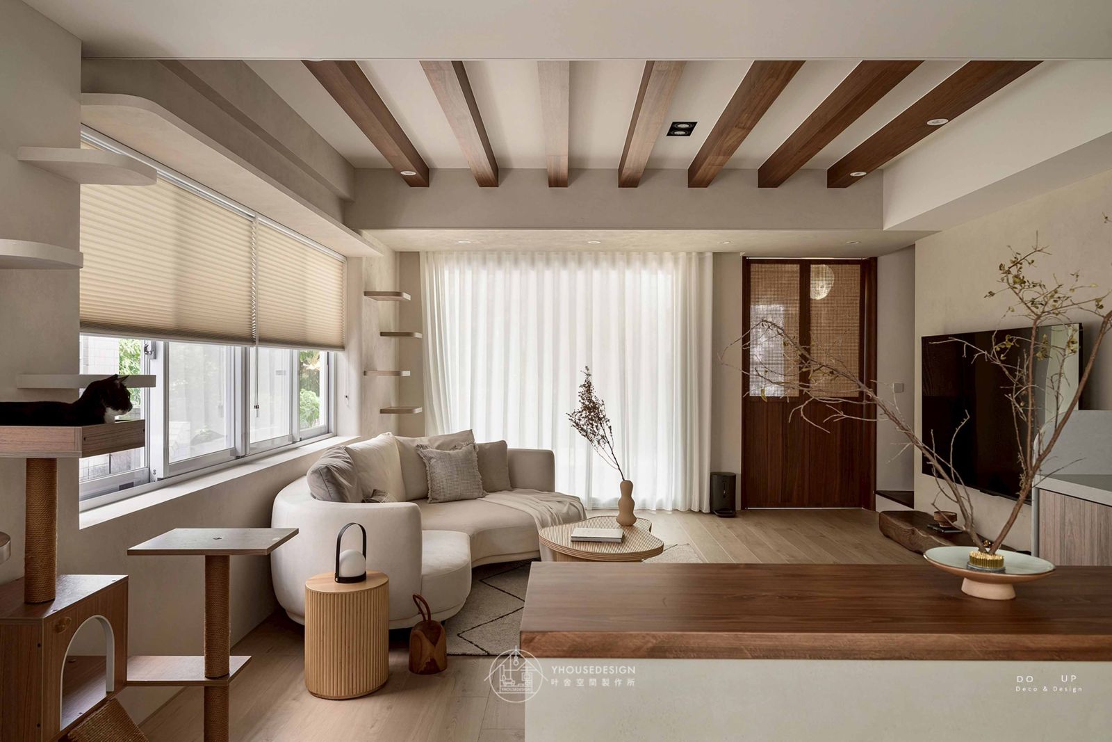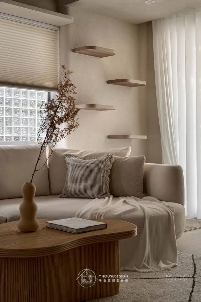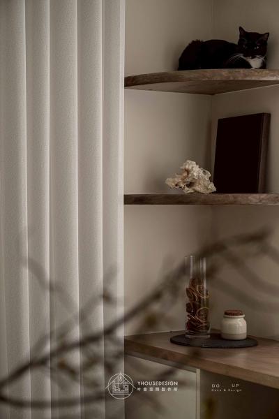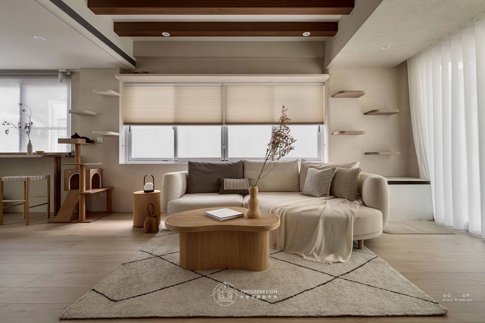 DO UP 的軟裝師這回像是與貓咪達成了一場午後約定,在設計師規劃的貓跳台與貓屋之間,室內設計師特意選用了圓潤弧線的奶油色布沙發,搭配一條觸感鬆軟的燕麥色披毯,讓度假感在指尖就能被觸摸到。