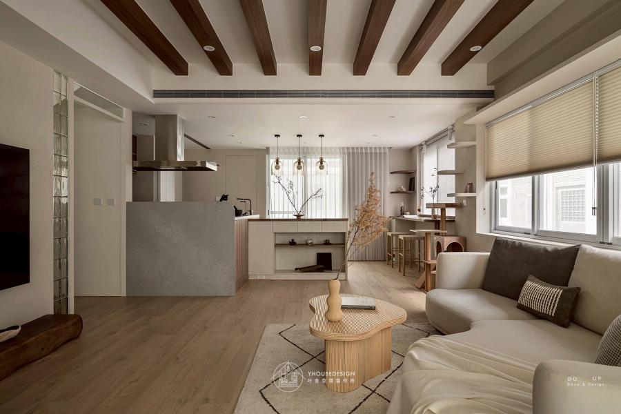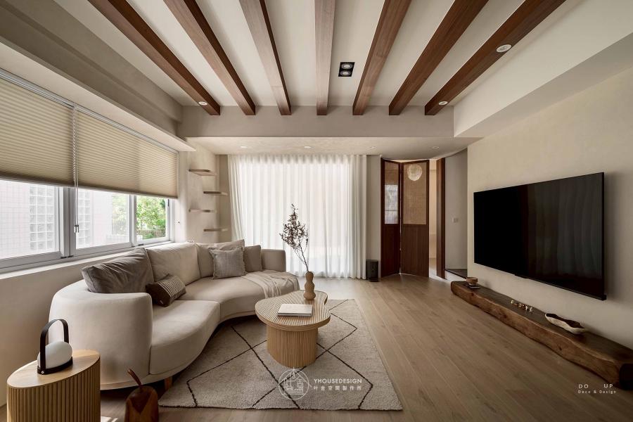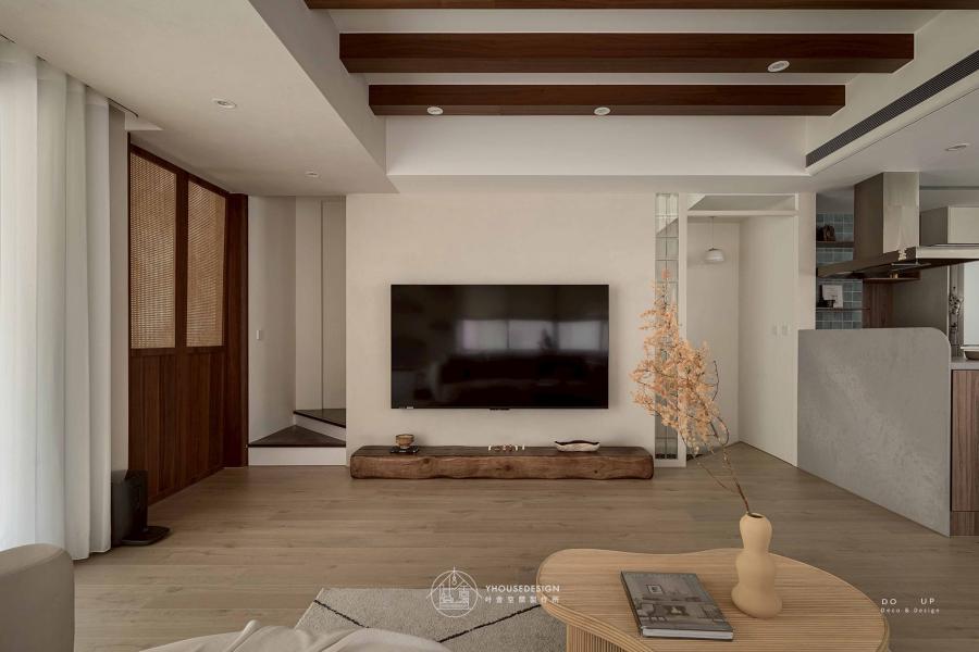 在這場島嶼度假的序曲中,天花板處橫跨的實木樑柱如同調色盤上的自然原色,為純粹的基調增添了厚實且溫潤的層次感. 電視牆下方,設計師大膽選用一塊極具自然原始感的實木原木塊作為電視櫃,其粗獷與細膩的碰撞,完美詮釋了「隱身於日常」的自在美學。