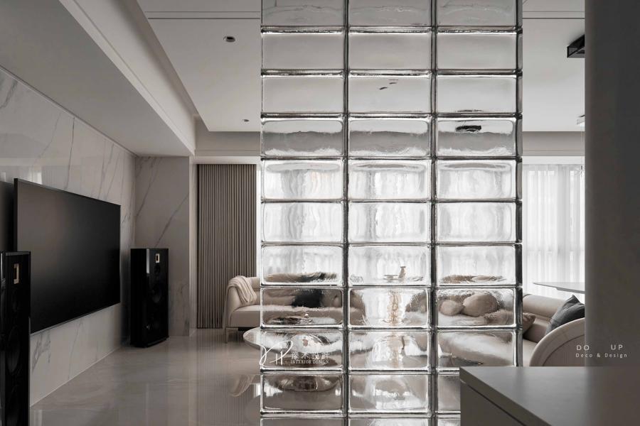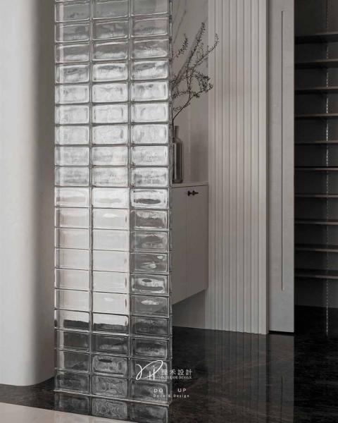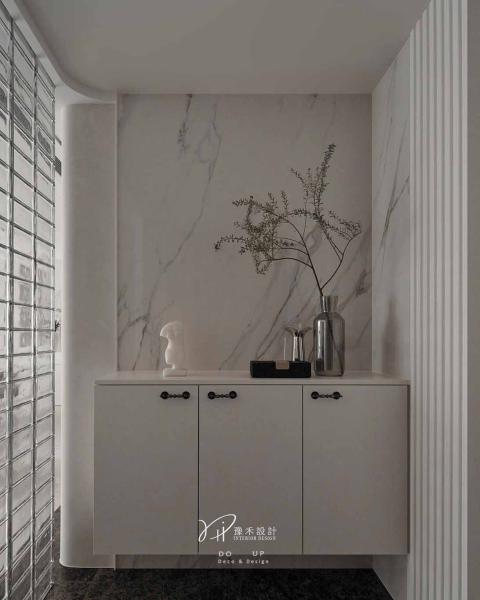 玄關區設計師用黑色的磁磚以及玻璃磚做出區隔,玻璃帶來的反光質感,搭配銀色玻璃花器做呼應,而大理石紋牆面的奢華感中,用黑色擺飾盒增加沈穩氛圍,加上流線雪柳、白色雕塑蠟燭,讓每一幕都是充滿細緻。