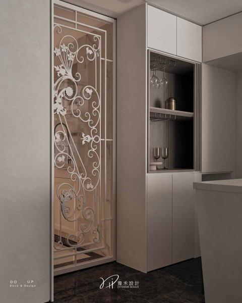 客餐廳的大器格局,沒有過度的裝修,室內設計師用精準的設計,格局、選材、燈光都不馬乎,擺拍設計師也不張揚的,用精準的選品擺飾來為空間加分,選擇玫瑰金、玻璃、白色點綴;不搶走吊燈的大器,在餐桌用造型的酒杯瓶、果盆增加氛圍,而將花器擺放在一旁的端景櫃,插上百合、流線型的枝條,讓視覺多增加一處重點,延續整體質感。