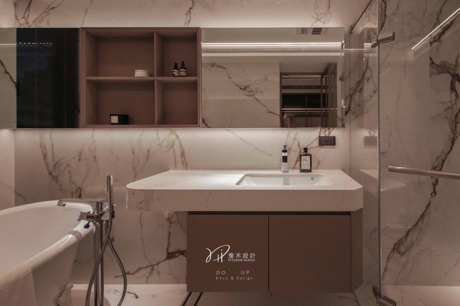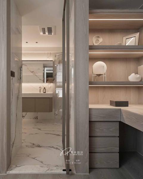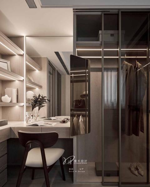 更衣室與衛浴空間木質比例拉高,搭配鐵件玻璃門片,再加上燈光的質感,讓每一件衣服、鞋子、包包都像精品一樣陳列出來,生活的每一時刻都是精緻、都是享受。擺拍設計師在梳妝桌的展示櫃挑選符合空間風格的飾品陳列,陶瓷藝術擺件、燈具、擺飾盒、相框,營造展示與使用情境。