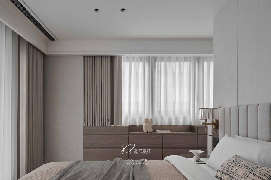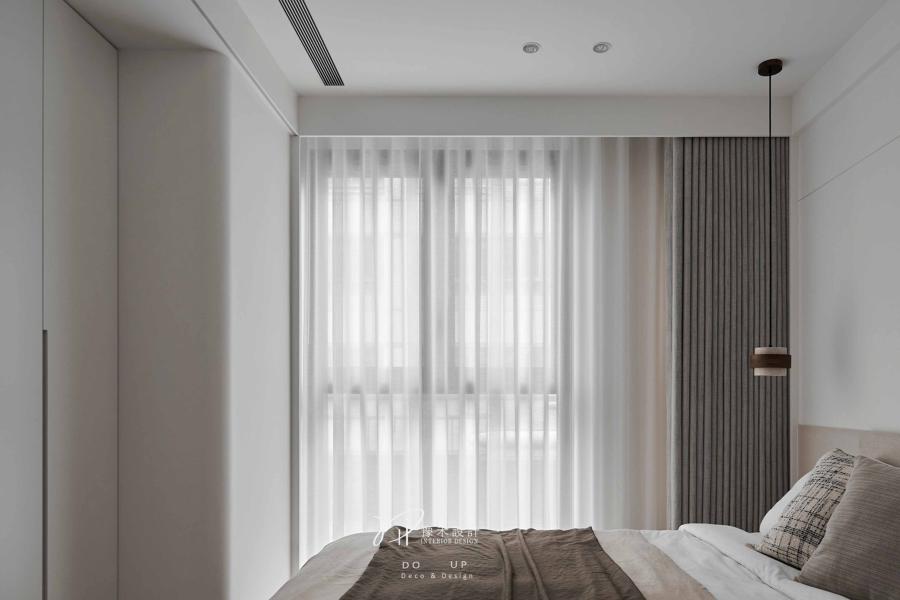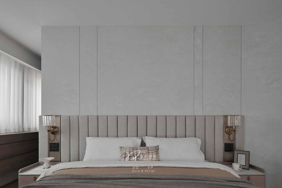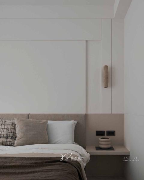 進到臥室空間是美好的雙面採光,室內設計師油漆選用有雲霧視覺質感的藝術漆,床區搭配米色繃布床頭與金屬拼接,是高級又溫暖的氛圍,擺拍師以簡約的床組配色與單一長型抱枕點綴,用最平凡的份量達到最不凡的妝點。