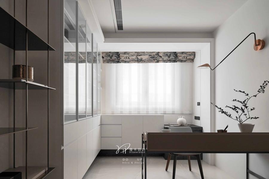 再前往書房與次臥的走道盡頭,擺拍設計師用大型落地透明直筒花瓶,插上流線木枝達到端景效果,靜靜的佇立,透過光線的設計與地板反射,形成另外一種隱約的美;書房空間俐落的線條設計,在前方的書桌用造型花器搭配線條特殊的枝葉,為空間帶來生氣,並將視覺延伸到壁燈,一旁的鐵件造型展示櫃,擺拍設計師用少量但精準得陳列飾品擺設,營造出文學、藝術的氛圍。