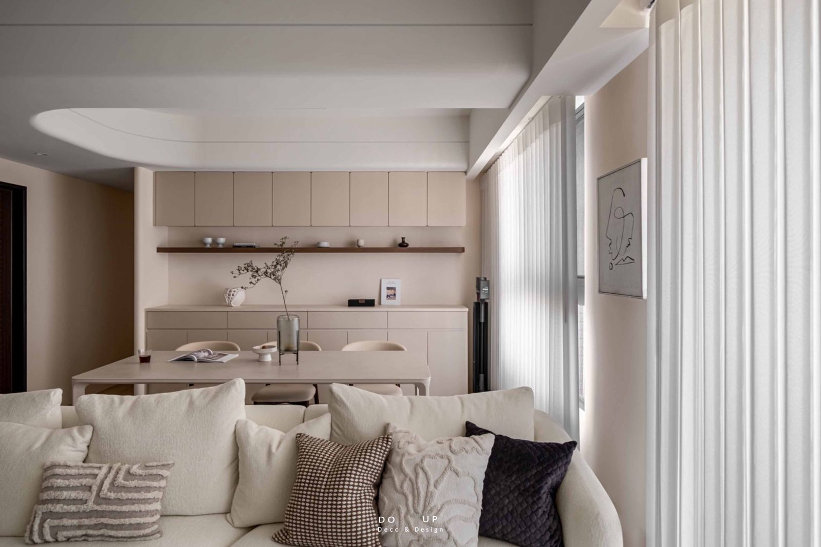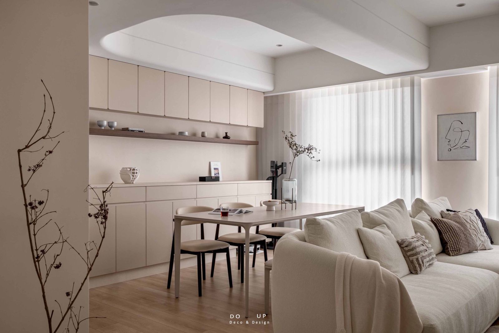 DO UP的軟裝師這回扮演了「慢活節奏的導演」,我們明白,在這樣純淨的底色下,每一件器物都是情感的註腳。在層架與檯面上,我們精準地擺放了幾只具備雕塑質感的白色器皿與具備生活感的裝飾書,透過家飾挑選的細膩比例,讓餐邊櫃成了家中最迷人的微型藝廊。