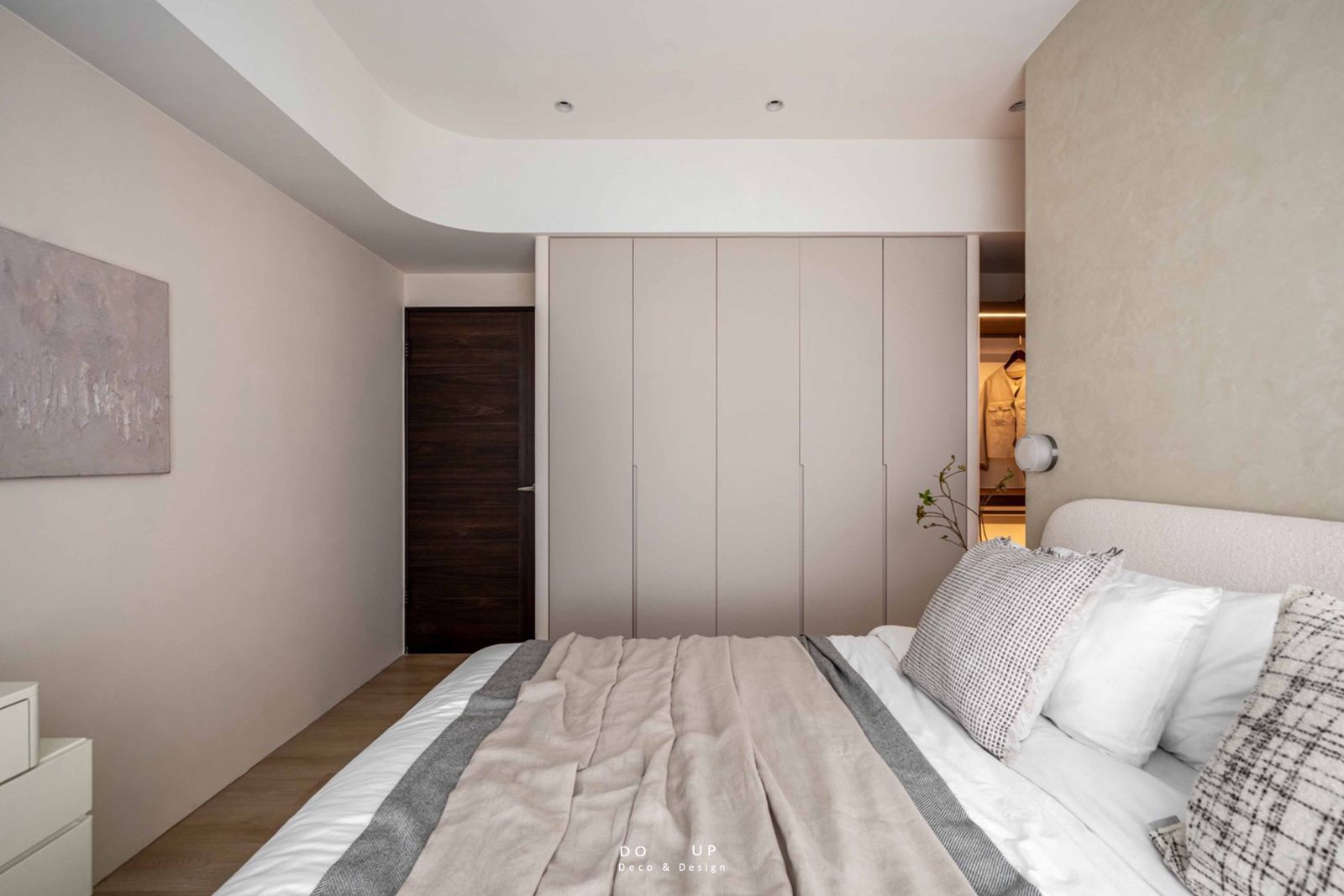 主臥室是這場最私密的終章。設計師延續了整體的奶油色調與弧型語彙,將床頭樑柱轉化為一道溫潤的圓弧,不僅化解了視覺壓力,更營造出一種如同被雲朵包圍的安全感。牆面選用了帶有細微手感的暖色漆料,搭配隱藏式的柔光燈帶,讓每一吋空間都流淌著舒心的度假氣息。
