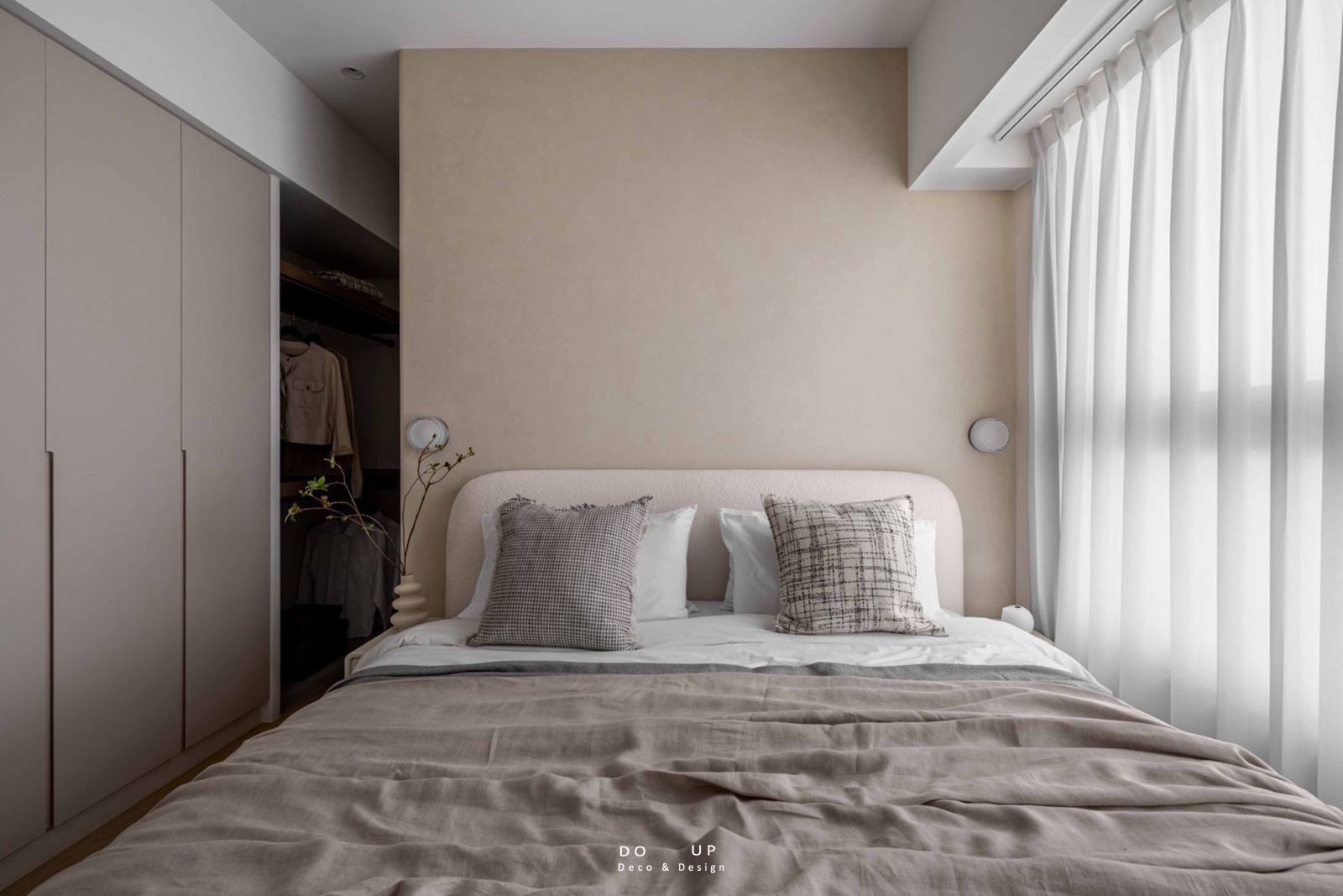 在這一片暖米色的基調中,DO UP選用了觸感極其蓬鬆的羊羔絨床頭板與亞麻質地的床寢,透過異材質的堆疊,讓「溫柔」擁有了實體的厚度。床上的黑灰格紋靠枕是我們埋下的知性註腳,在極簡中勾勒出一絲沉靜的律動感。