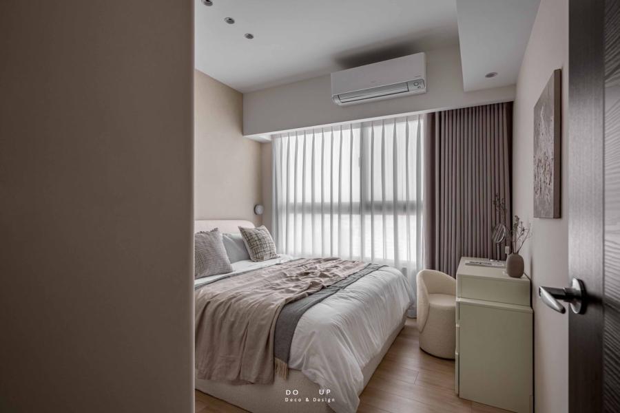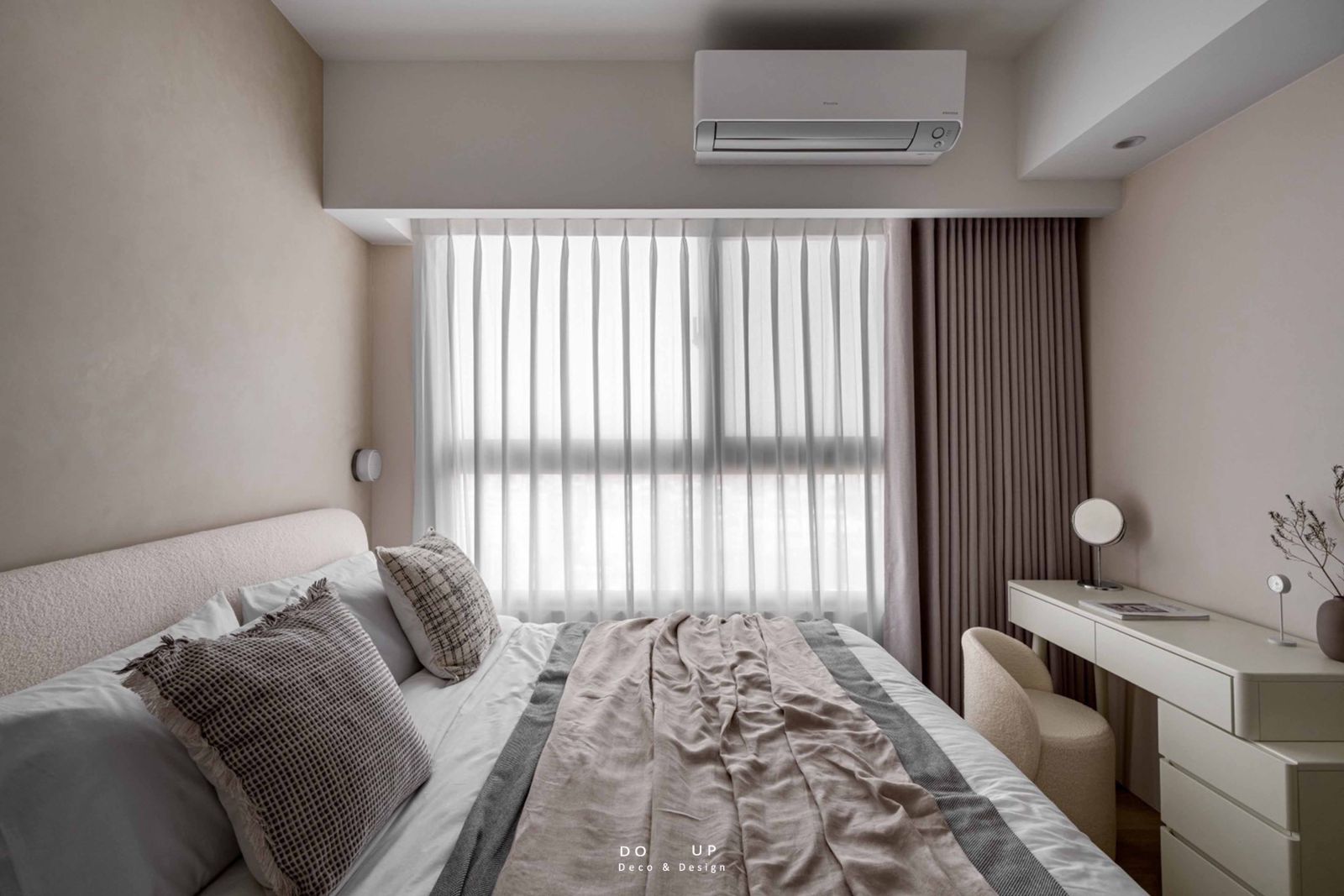 為了讓生活機能與美學並存,設計師規劃了流暢的梳妝空間與隱藏式更衣區。軟裝師在梳妝台上點綴了簡約的圓鏡與花藝,並在光線最美處放置了一張奶油色布質單椅,讓晨間的梳洗也成了一種感官的享受。這場由沐淯設計與 DO UP 共同織就的空間陳列擺拍,讓臥室不再只是睡覺的場所,而是一處能讓靈魂徹底放鬆、採集光影印記的純淨境地。