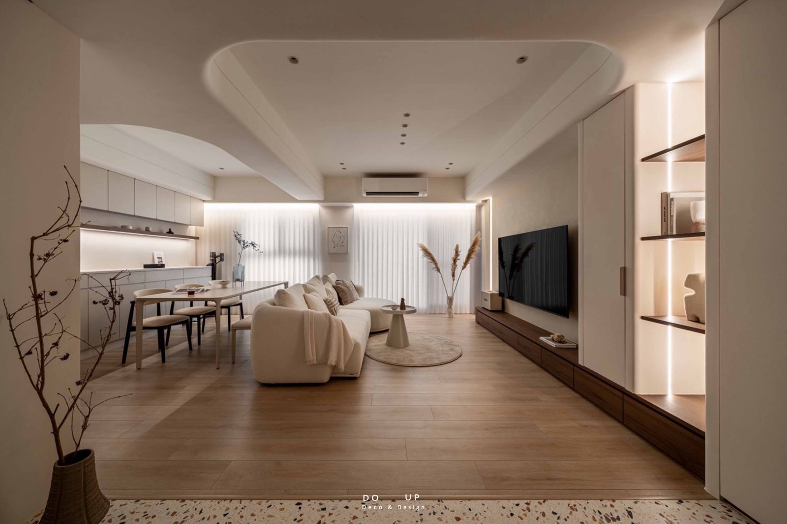 走進客廳,室內設計師視覺的焦點界分了客廳與餐廚區,同時又允許光線自由穿梭,讓空間保持通透。天花板處大尺度的弧型梁柱處理,不僅消弭了結構的銳利,更讓視線隨著光影自在流動。木質的餐桌,營造出溫馨的圍合感。