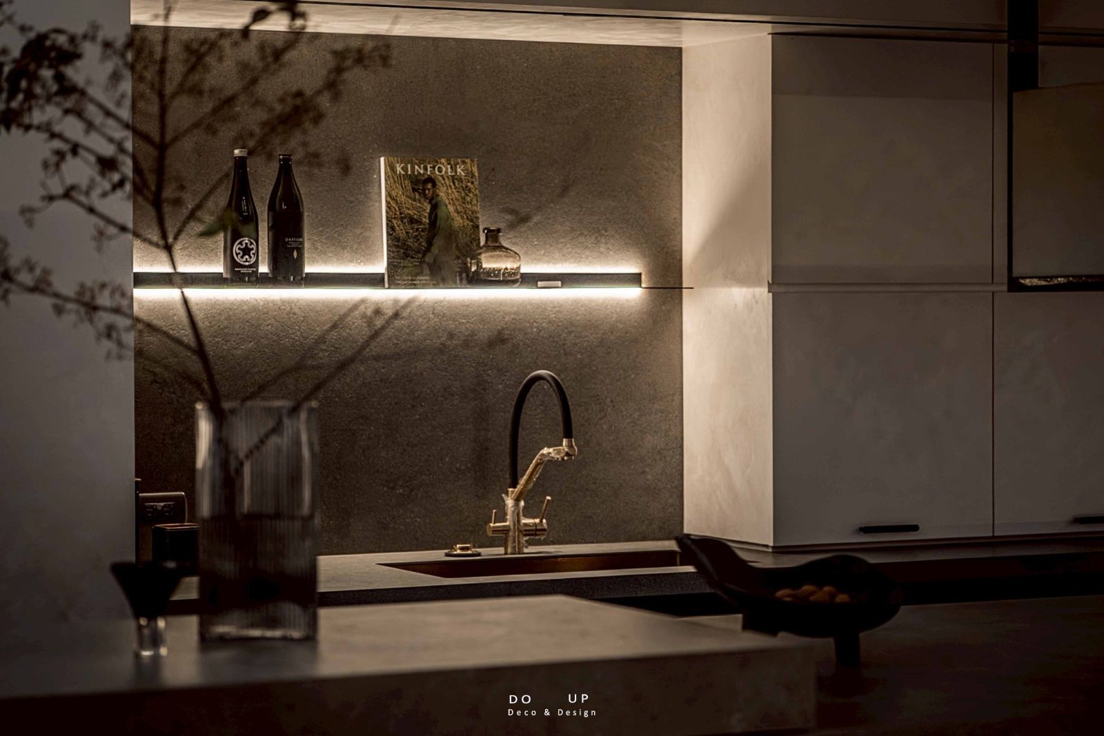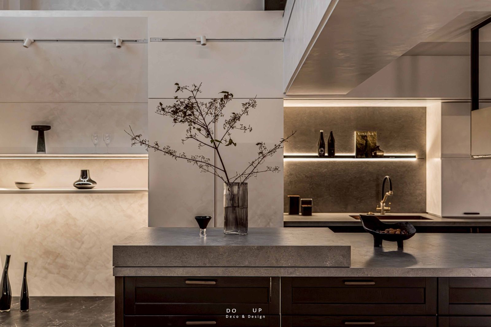 在擺拍設計的構思中,中島與牆面層板的陳列是視覺核心。我們在層板上錯落擺放了雜誌、深色酒瓶與極簡器皿,透過高度與體積的變化創造視覺節奏;中島則以一只具份量感的條紋玻璃花瓶為主角,插上姿態恣意的枯枝,將大自然的有機線條引入室內。這種「以簡馭繁」的空間陳列手法,成功呼應了室內設計師對光影細節的苛求,讓每一件飾品都像是從牆面上生長出來般自然。