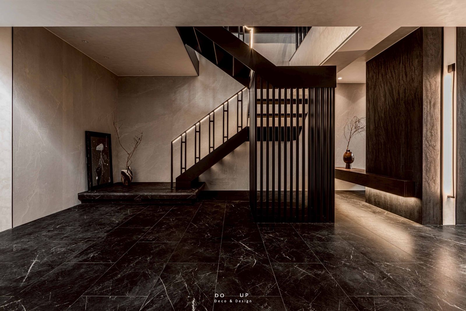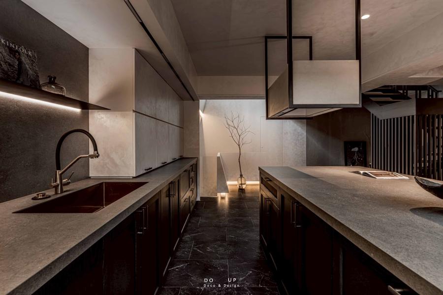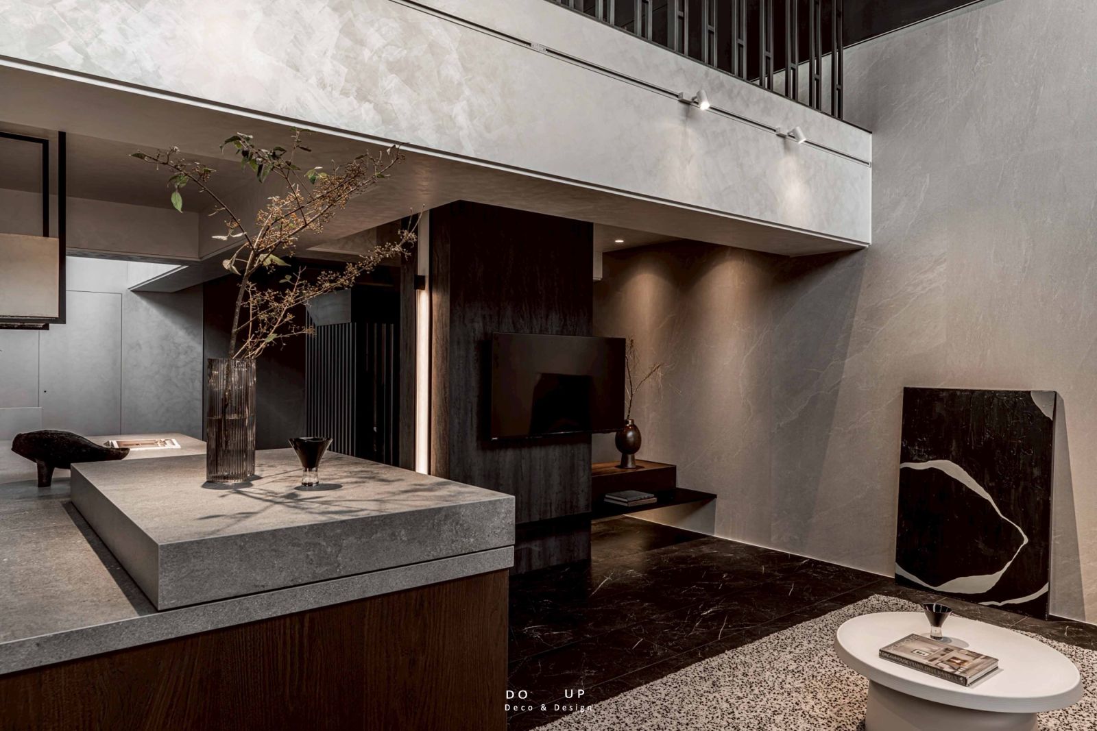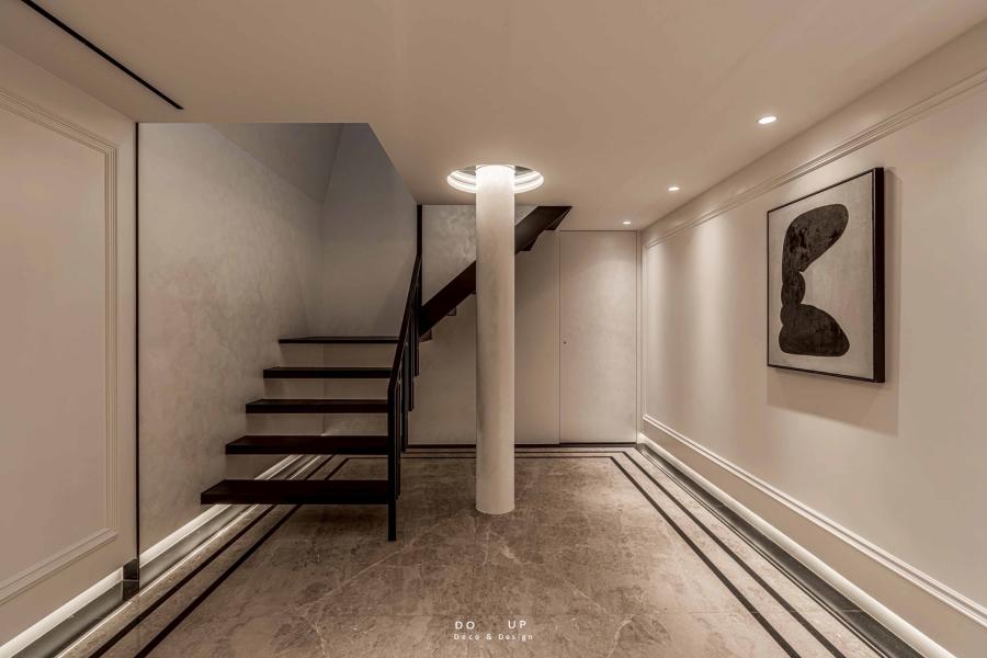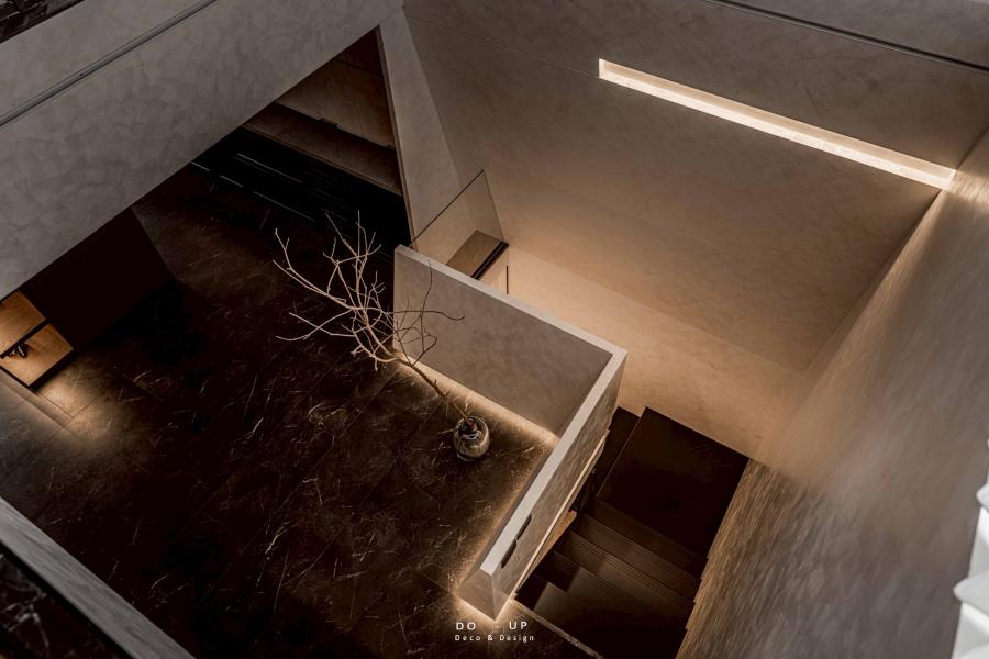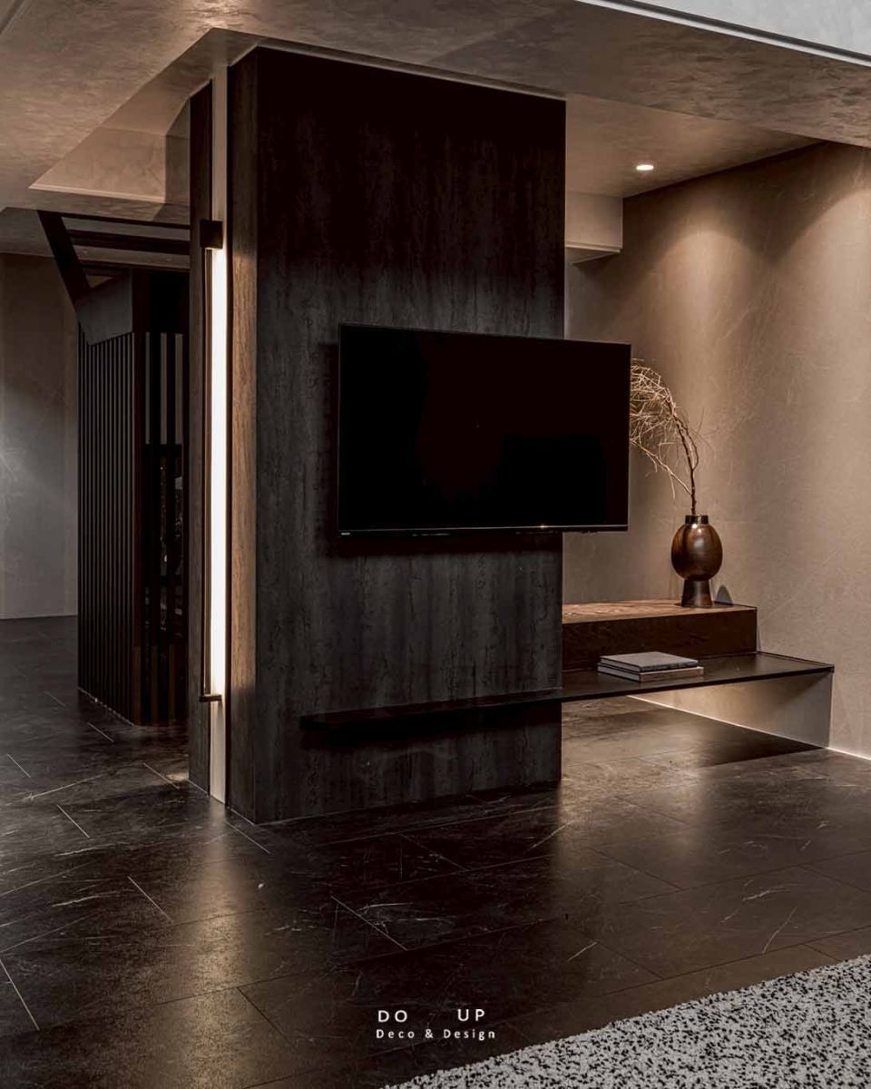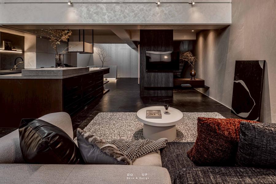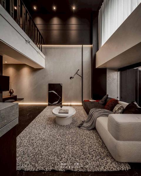這座由室內設計師精心打造的空間,運用了大面積的沈穩石材與細膩的藝術塗料,構築出層次豐富的建築體感。挑高的結構與開闊的動線,賦予了場域磅礴的氣勢,在自然光與燈光設計的交織下,黑白灰的基調呈現出一種靜謐而深邃的奢華感。