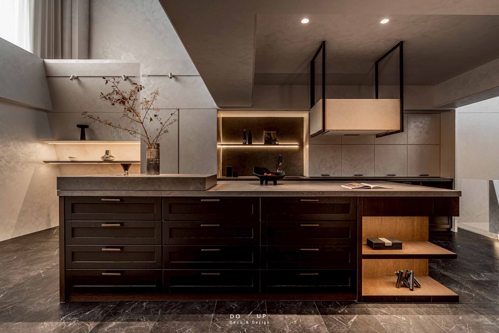 為了契合空間本身的硬裝語彙,擺拍設計師在陳列上採取「去蕪存菁」的策略。捨棄了繁雜的堆砌,轉而挑選具備強烈線條感與質感的飾品。例如在石材中板區點綴枯木花藝,以有機的自然曲線打破垂直水平的嚴肅;在深色的石英檯面上,擺放造型簡約的器皿與幾何物件,讓物件與空間進行無聲的對話,轉化硬冷材質的邊界。