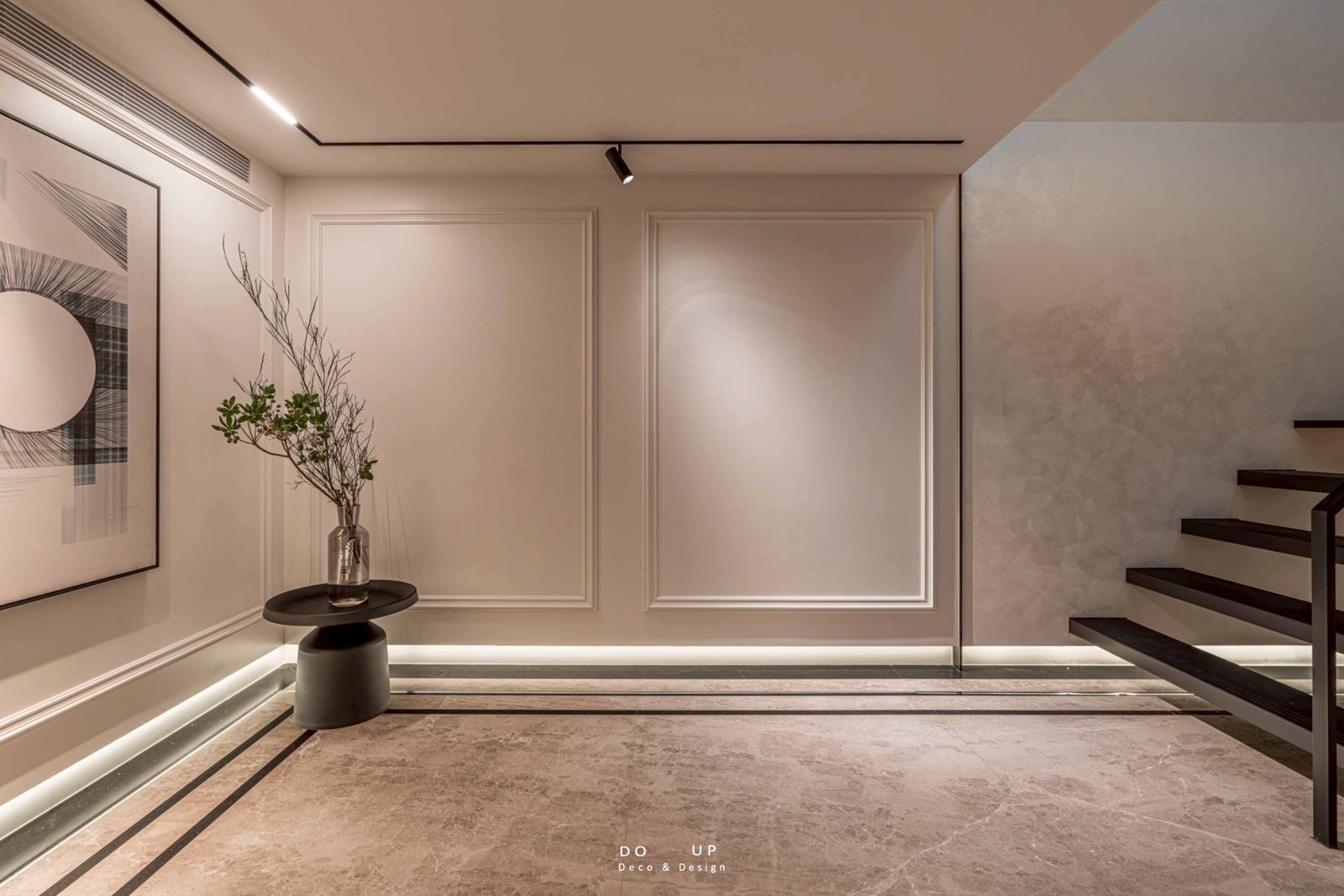 在玄關轉角,我們進行了端景設計。擺拍設計師特別挑選了一幅符合空間氛圍的抽象畫作,與側邊黑色圓形邊几、高聳纖細的花藝形成視覺對話。畫作簡單卻沈穩的色彩與地面的大理石完美搭配,而枯枝的有機曲線則打破了幾何空間的生硬感。透過這種「點、線、面」的空間陳列手法,我們成功將過渡性的玄關空間轉化為安頓身心的視覺焦點。