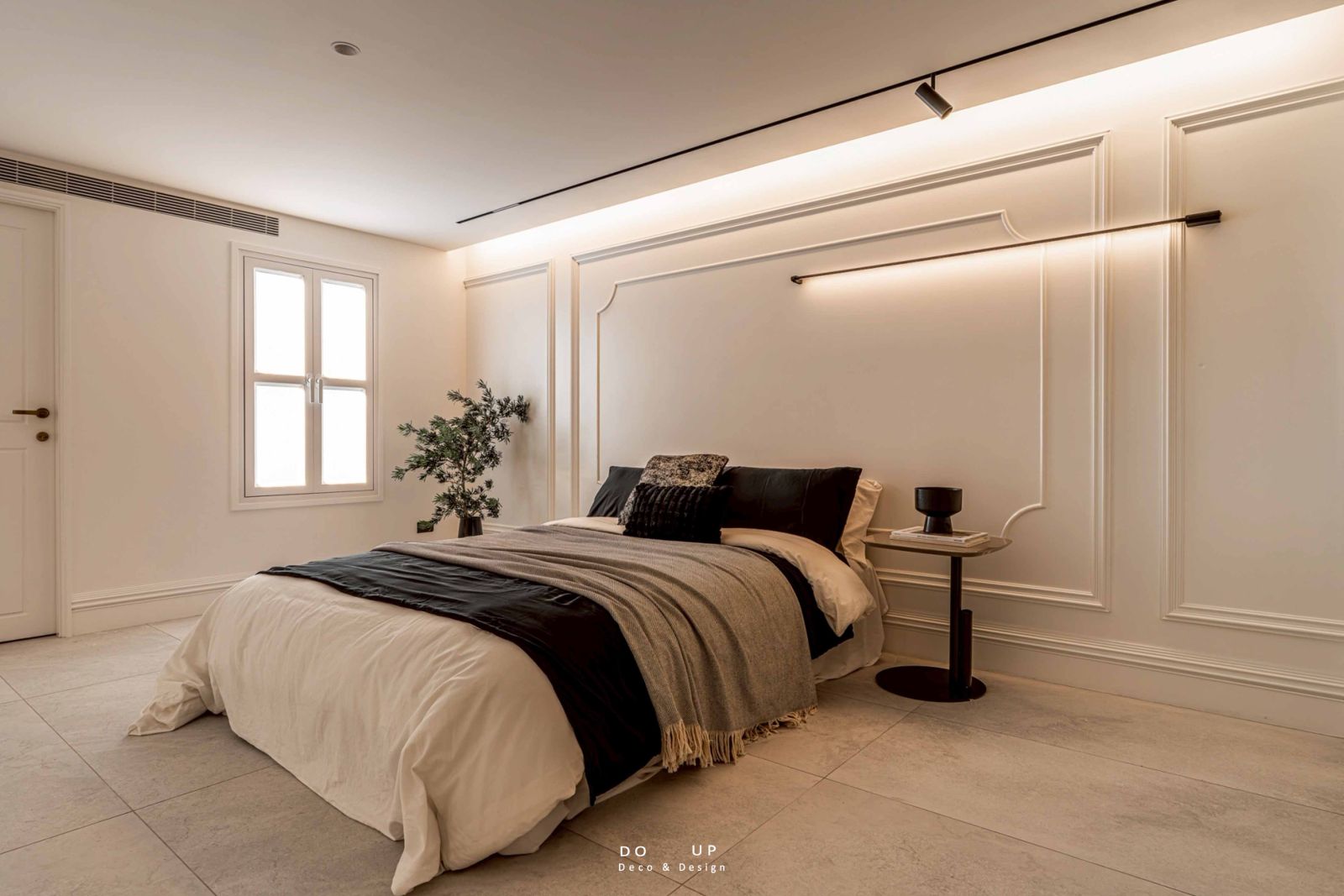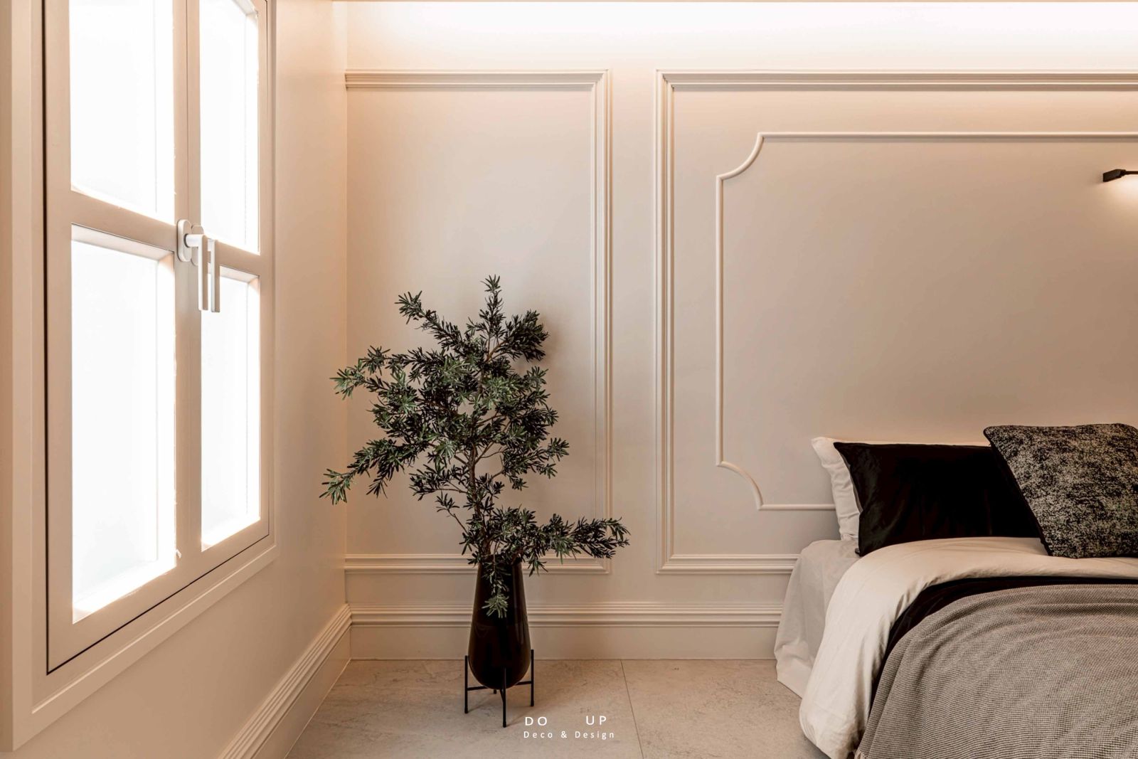 進入臥室核心,床寢的挑選是整體氛圍營造的關鍵。擺拍設計選擇了黑色天絲材質為基底,再加上亞麻紋理的灰色蓋毯,搭配炭黑色與黑白紋理抱枕,透過材質的層次碰撞,轉化了原本素雅的牆面,增加舒眠區的視覺溫度以及精緻。在床頭兩側,我們採取了不對稱的陳列策略:左側擺放一只造型感十足的落地植物,引入戶外綠意;右側則以簡約的邊桌陳列深色飾品與書籍,展現一種低調且不經意的優雅。