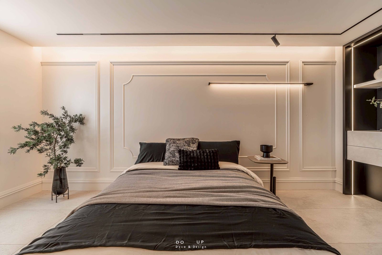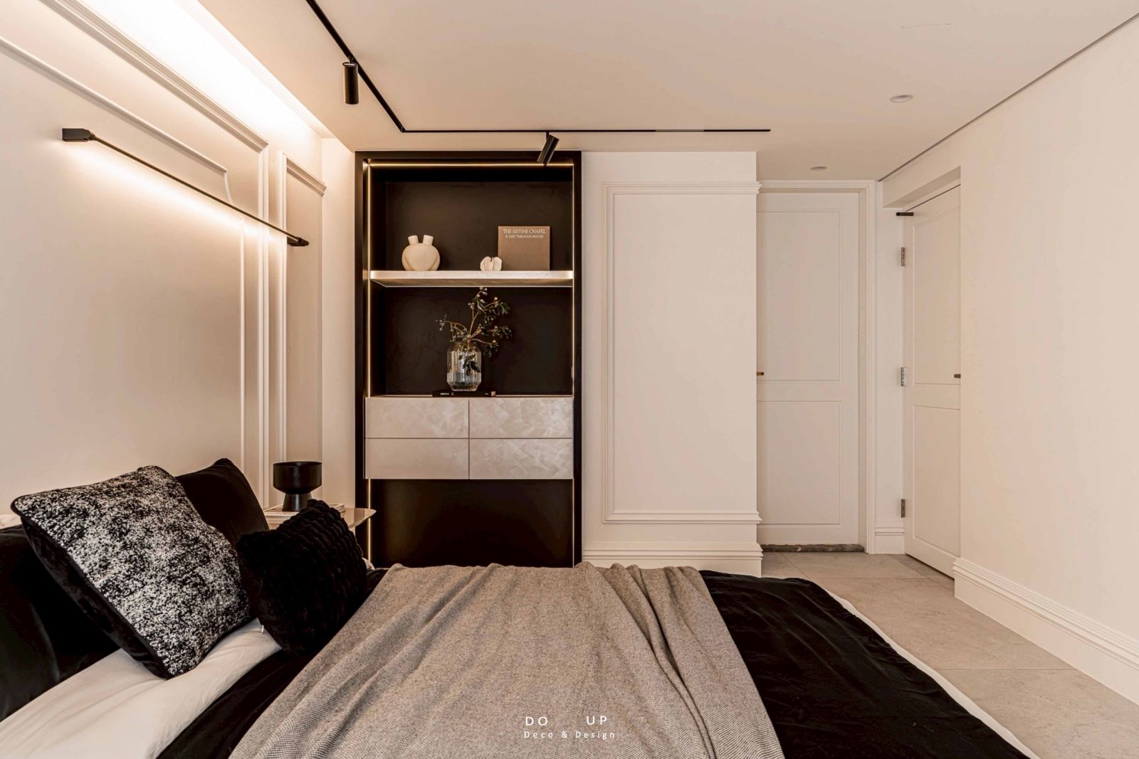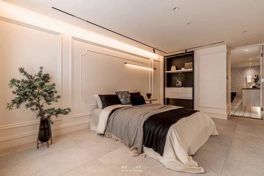 最後,側邊的黑色嵌牆端景櫃成為了臥室空間的生活寫照。我們在開放式的層板上錯落擺放了幾何造型的白色瓷器、輕柔的乾燥花藝以及藝術書冊。這種「虛實交錯」的空間陳列方式,不僅體現了擺拍設計對細節的極致追求,更完美襯托了室內設計師所營造的寬闊體感。從玄關的藝術引入到臥室的舒眠沈思,每一處細節都交織成專屬於此案的獨特韻律,展現了專業陳列賦予空間的生命力。