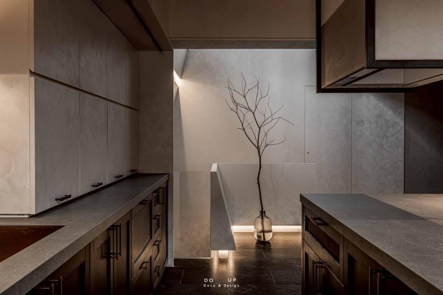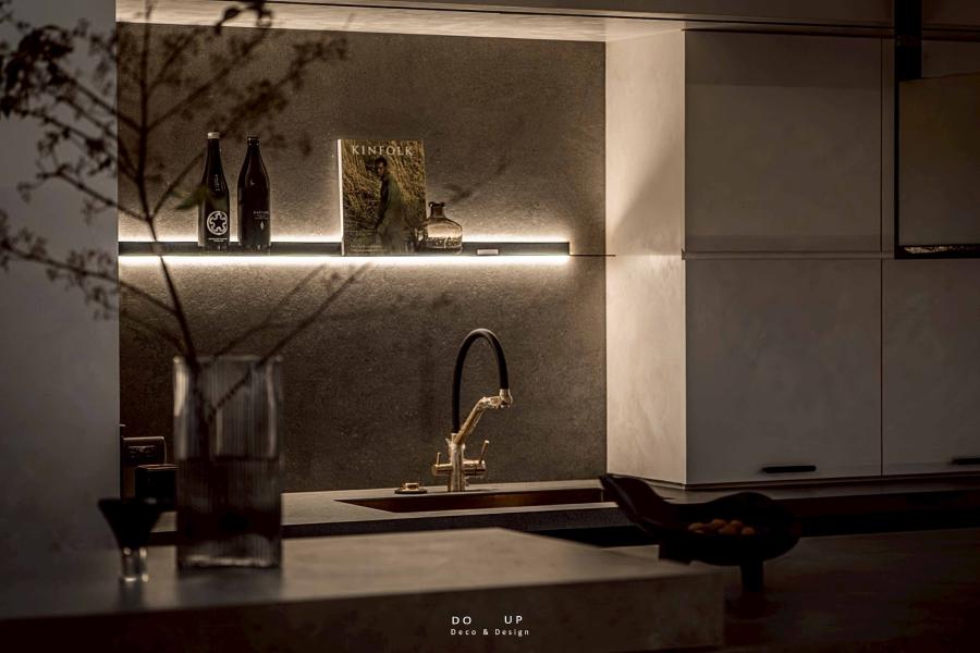 室內設計師在此處展現了極致的材質對比:深褐色的木質櫥櫃搭配冷調灰石材中島,牆面則以細膩的手刷塗料與洗牆燈光營造出如藝廊般的質地。這種「剛柔並濟」的裝潢基調,為我們的空間陳列提供了絕佳的發揮舞台。我們試圖在理性的幾何線條中,置入具有生活溫度的物件,讓沈穩的餐廚區不再只是機能空間,更是居家美學的延伸。