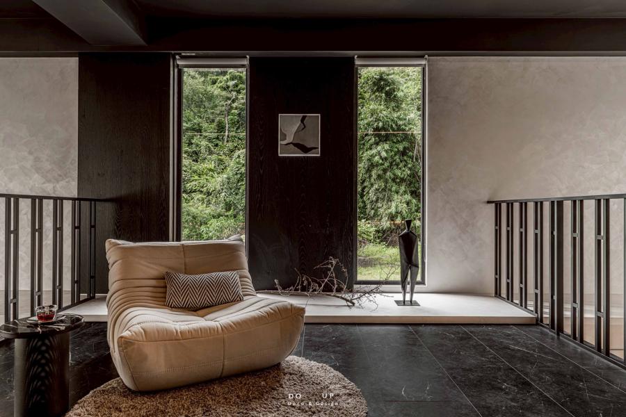 樓上的休憩空間,則是這場視覺饗宴的寧靜終章。我們挑選了一張造型溫潤的純白單椅,與戶外的綠意交織,並在側邊點綴細緻的小型藝術品。這段陳列歷程不僅體現了擺拍設計對場域精神的理解,更完美襯托了室內設計師所營造的寬闊體感。每一處細節都交織成專屬於此案的獨特韻律,展現了專業陳列賦予空間的生命力。