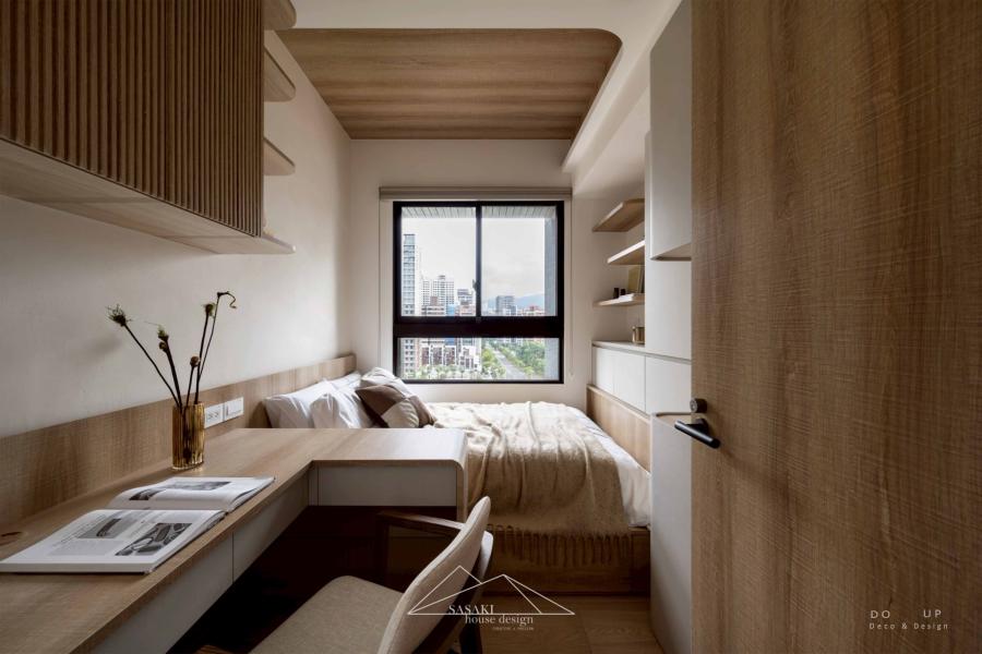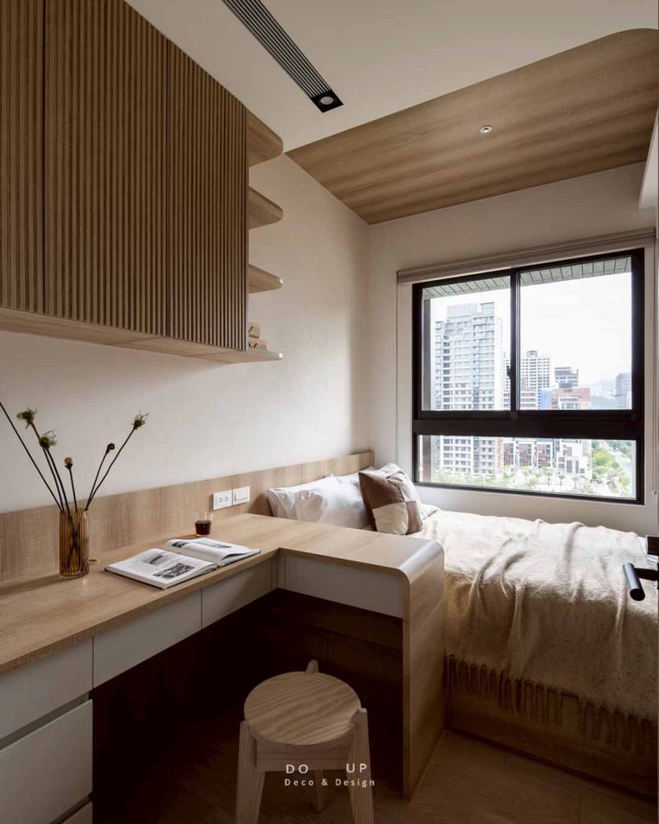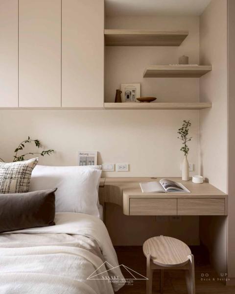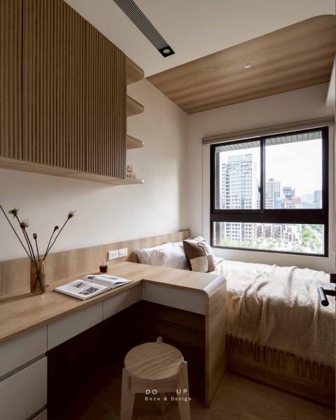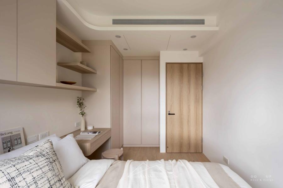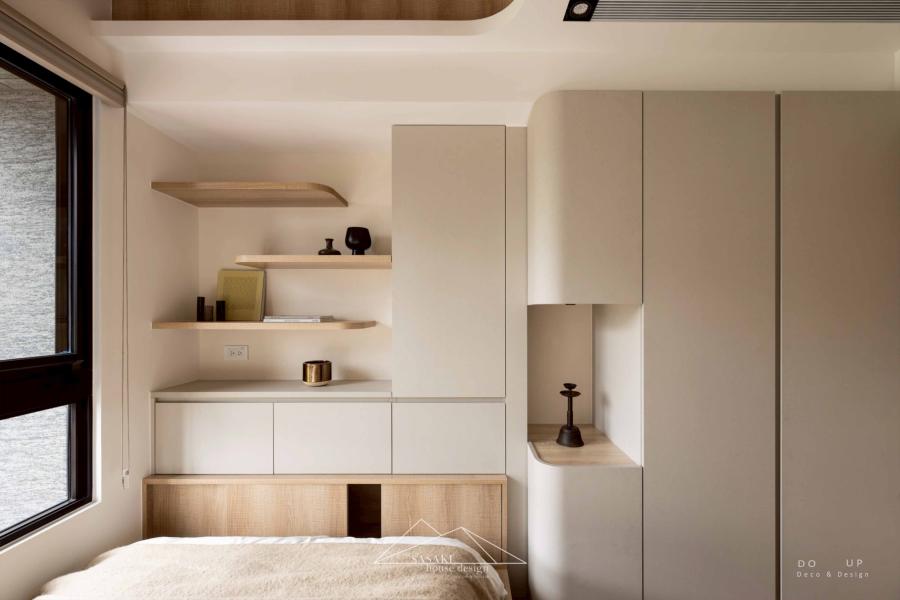 在臥室的硬裝設計上,延續了公領域的靈魂元素,將「圓弧」與「暖白」的設計語彙發揮得淋漓盡致。主臥室用相較公領域較淺的木紋以及米色櫃體,巧妙讓私領域的視覺感能更感到放鬆,在一體成型床頭到懸空的書桌,展現出圓潤又溫度的設計工藝;次臥室則靈活運用垂直格柵與局部木質天花,在有限的坪數內創造出豐富的空間層次,讓木質調從牆面延伸至頂部,營造出如日式旅宿般的包覆感。