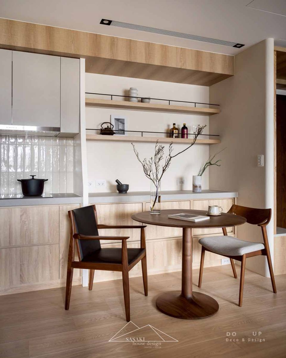 轉向軟裝擺拍的選品與配置,我們特別著重於如何透過飾品展現「慢生活」的溫度。在開放式層架上,捨棄了繁雜的備品堆疊,改以量體輕巧、色調質樸的日式陶瓷杯盤、手工陶甕與日本酒瓶交錯陳列,並透過錯落的留白維持視線的通透。餐桌擺拍則是整體氛圍的核心,深木色圓桌與線條優美的實木餐椅,為用餐區增添了豐富的觸覺層次。桌面上僅擺放一支姿態延伸的枯枝花藝與極簡茶具,以剛好的體積感點亮空間,呈現出日常卻不失格調的質感化樣貌。