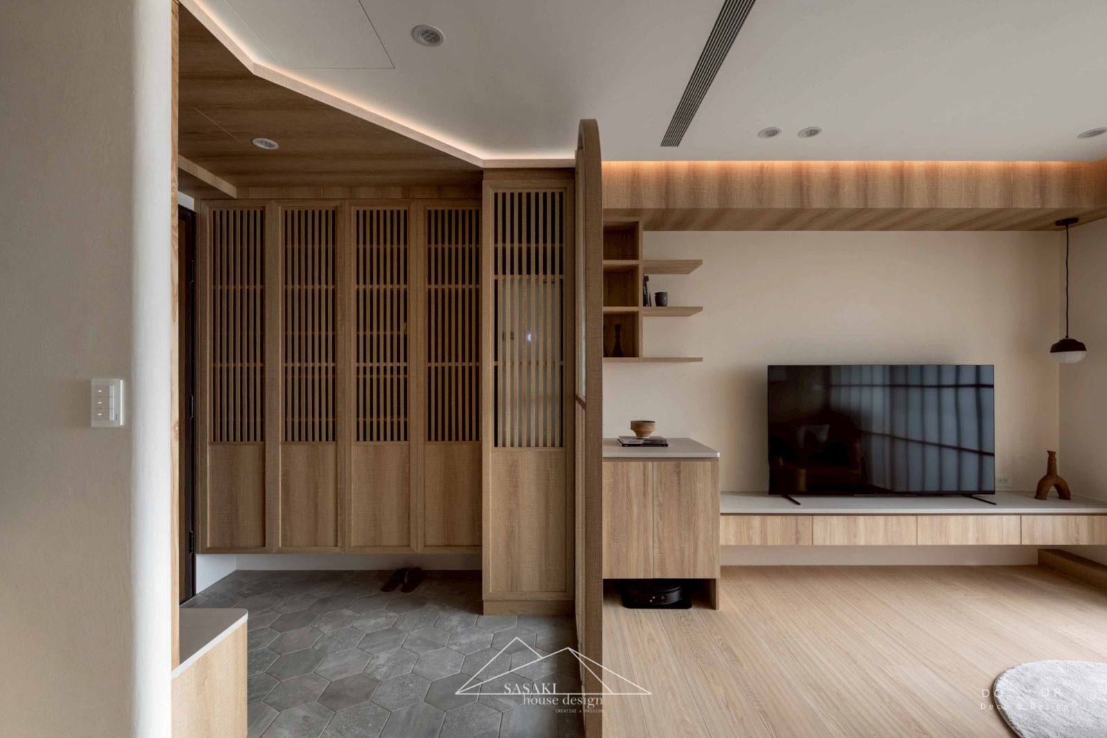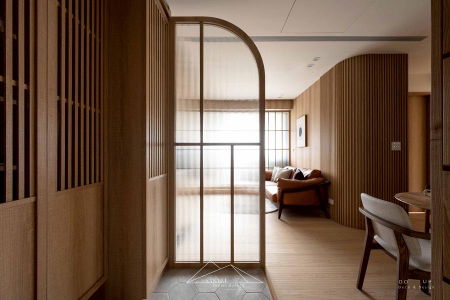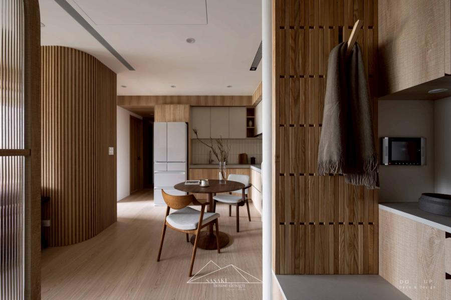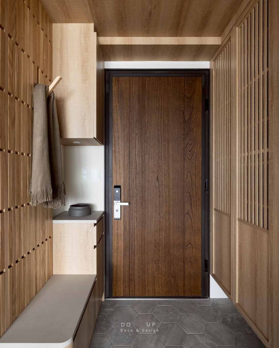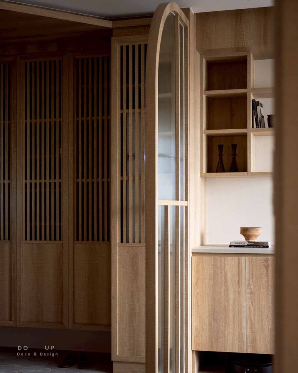 室內設計師的裝潢設計上,空間深度演繹了當代日式風格的精髓,將骨架構築得細膩且極具層次。設計師大量運用暖木質調作為視覺底色,並巧妙地結合格柵元素與長虹玻璃,讓光影在虛實交錯間自由流淌。最具代表性的莫過於玄關處的弧形屏風與公領域牆面的立體條板設計,這類圓弧工藝消弭了建築稜角的冷冽,透過柔和的曲面引導動線。天花板與櫃體邊緣的精確收邊,搭配具有落塵區機能的六角地磚,不僅強化了日系宅邸的儀式感,更在建材選用與比例配置上,展現出職人等級的空間安定感。