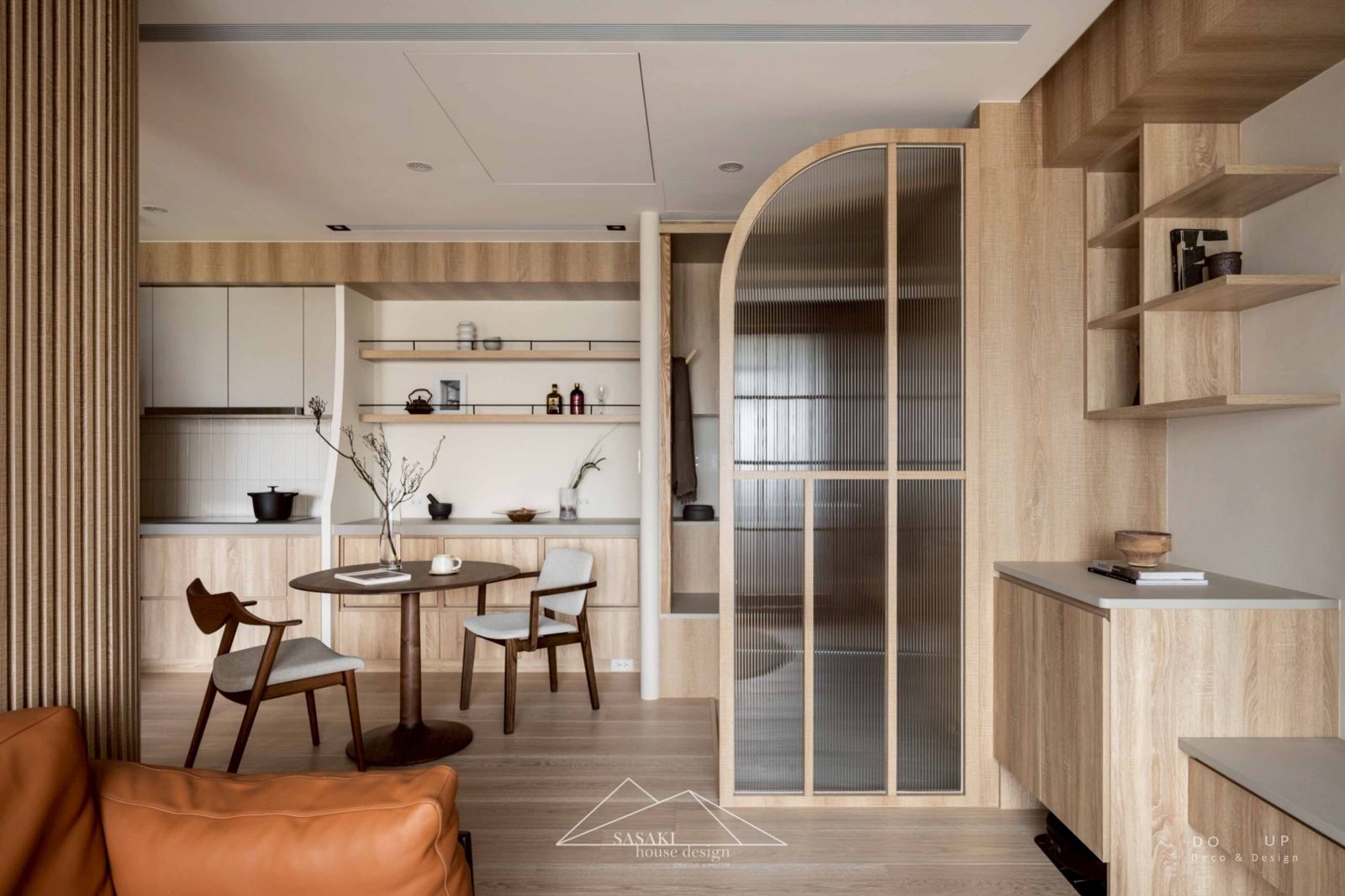 在開放式餐廚的硬裝規劃上,空間展現了極致的機能美學與層次感。設計師運用大面積暖木紋櫥櫃與米白色交織,構築出視覺的平衡點與重心,廚房牆面的長條磚在燈光的映射下散發出細膩的質感。空間中最吸睛的莫過於順著天花線條延伸的曲面立柱與層架,這些圓弧細節與客廳遙相呼應,消弭了開放空間的銳利邊角。在日系基調中設計出乾淨的俐落度,讓料理與用餐場域不僅是機能空間,更是居家設計的視覺焦點。