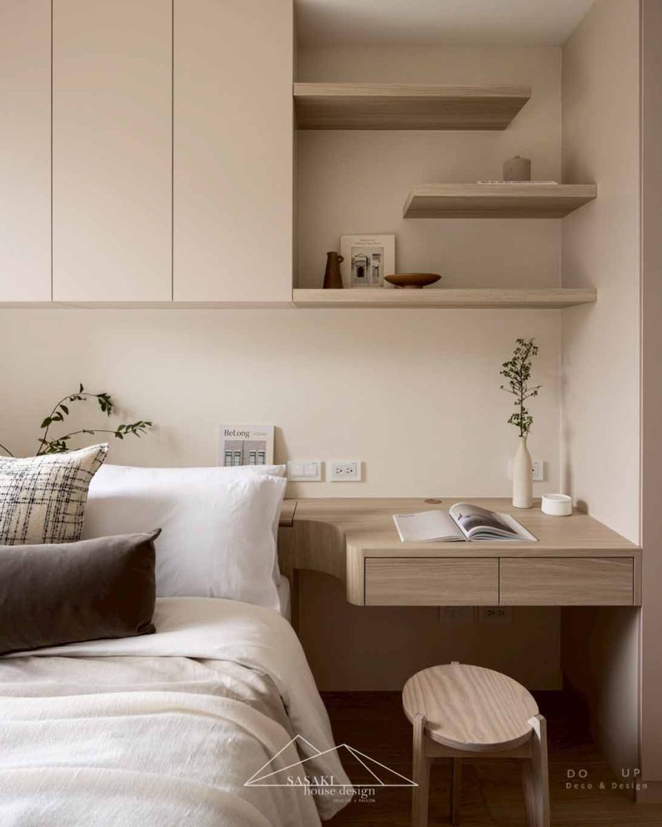 次臥室的擺拍則側重於生活機能與美學的共生,呈現出更為緊湊且溫馨的生活感。在坪數精確的空間裡,擺飾的量體被細心控制,無論是床尾層架上的陶製器皿、書籍,還是書桌上的花藝花瓶擺飾,皆是以適中的比例點綴,避免視覺上的混亂,並且都是按著空間色調、風格精心搭配。床鋪上層疊著針織毯與異材質拼布抱枕,透過布料的柔軟紋理中和了大量木質硬體的剛硬感,讓攝影畫面捕捉到室內設計對細節的極致追求,完美演繹出質感化與生活化並行的寢臥美學。