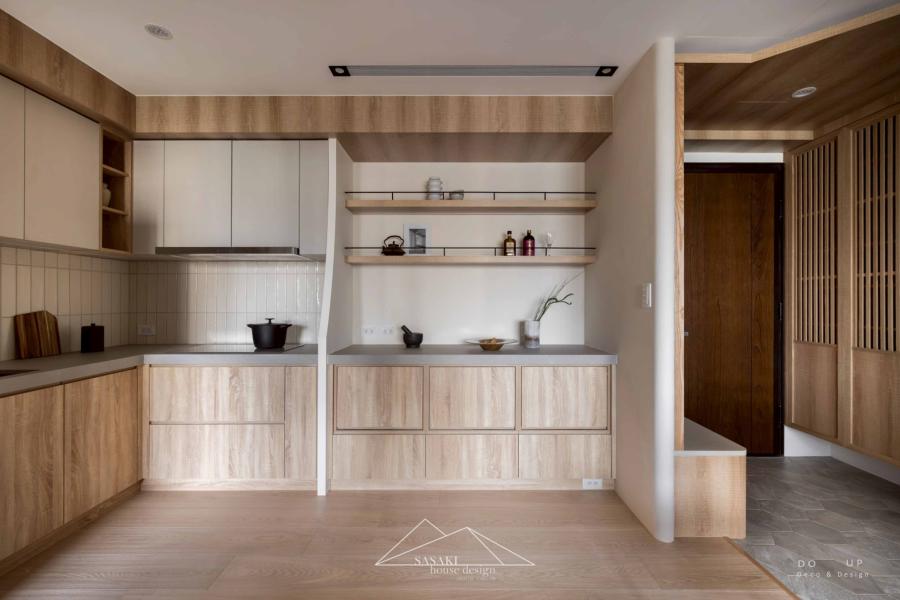 透過生活化的美學視角,這片餐廚空間被定義為家人情感流動的樞紐。擺拍時特別強調「使用中」的氛圍,無論是爐灶上溫潤的鑄鐵鍋,還是餐桌上隨意擱置的一本書與咖啡杯,皆是為了打破樣品屋的冰冷感。這些飾品在大小比例與色彩選擇上,皆依循著空間整體的暖大地色系與原木色澤,讓軟裝自然地消融於硬體裝修之中。這種將硬裝的結構美與軟裝的情境美完美揉合的手法,不僅呈現了設計師對空間機能的嚴謹追求,更透過擺拍傳遞出一種讓人神往、舒心且充滿溫度的日式食尚生活。