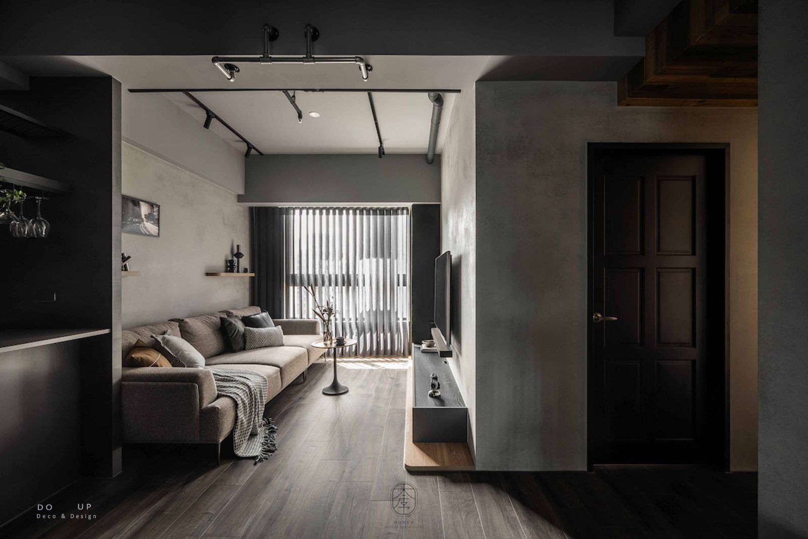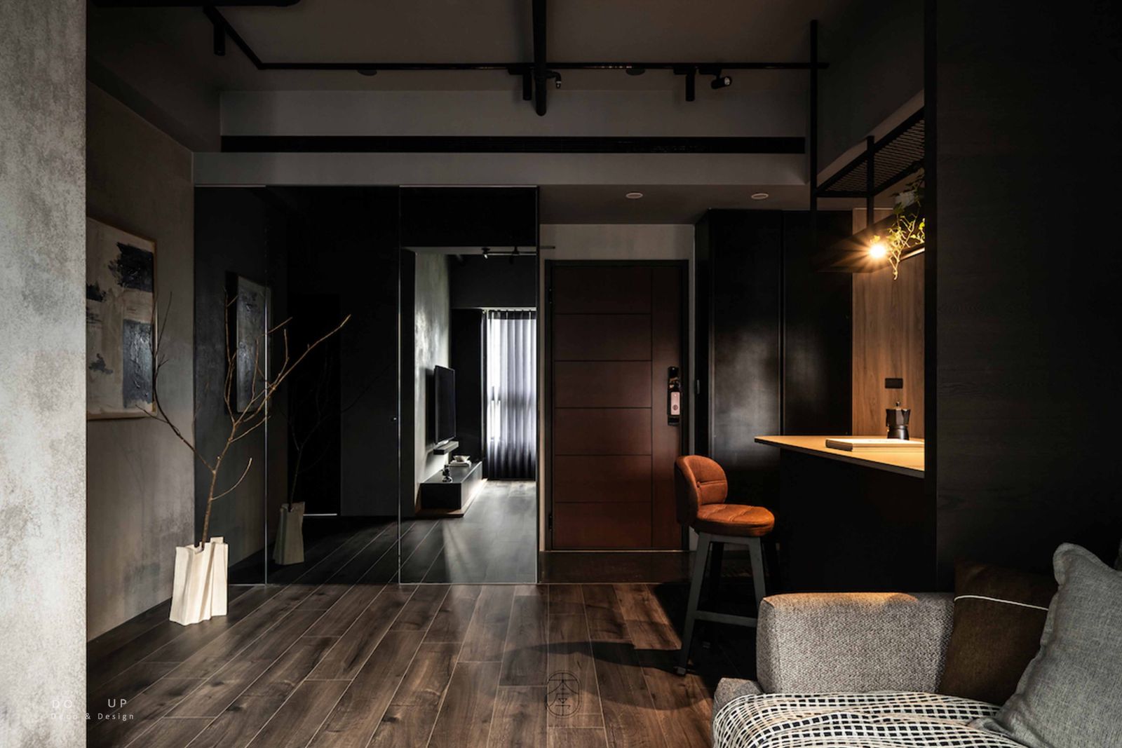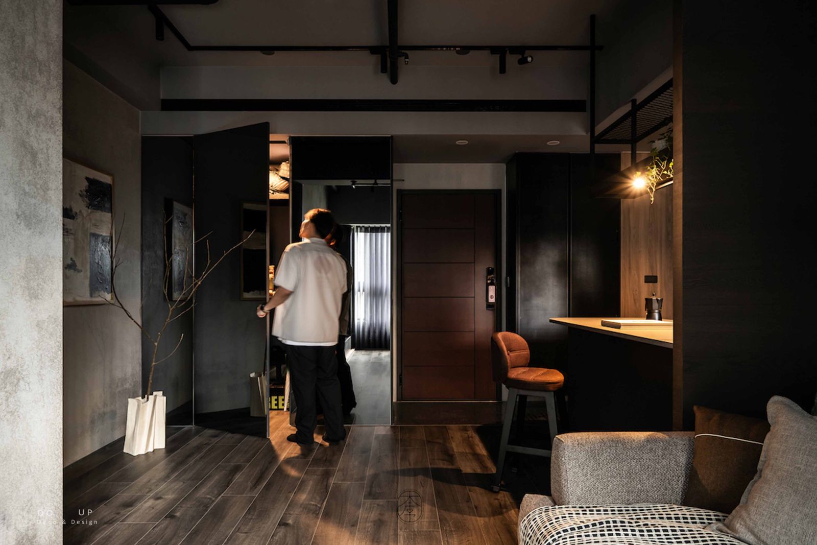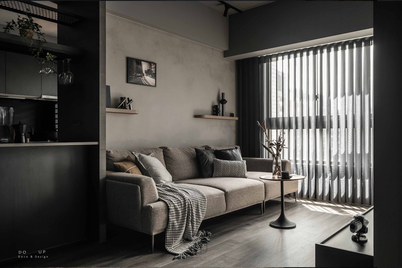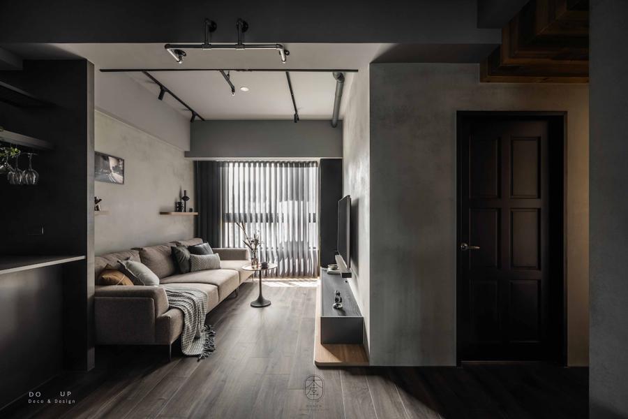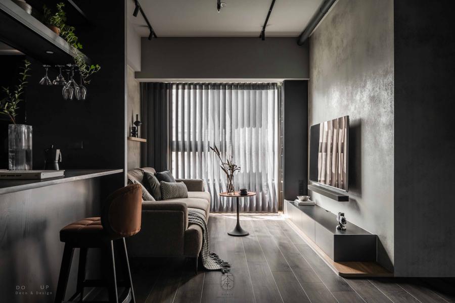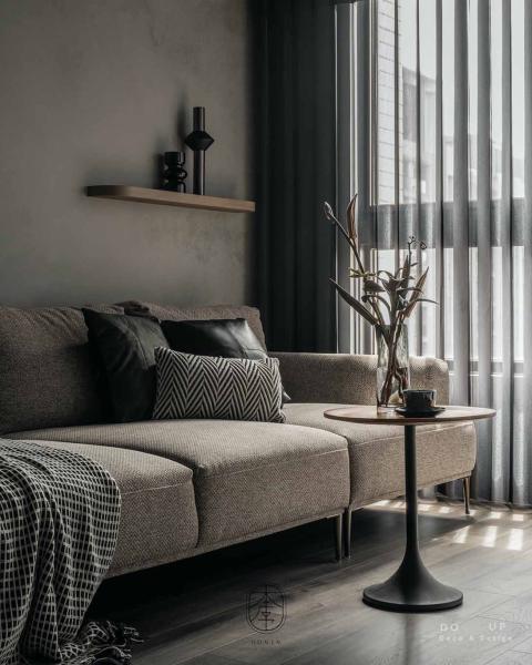 DO UP 在深色美學中,材質的觸感決定了空間的溫度。客廳中心定錨了一座粗織質感的燕麥色布沙發,搭配深褐色系與帶有幾何圖騰的靠枕。我們特意在沙發上隨意披上一條黑白交織的編織披毯,這份柔軟的介入,不僅在視覺上跳脫出背景的灰階,更為居住者提供了一處觸手可及的溫暖依靠。