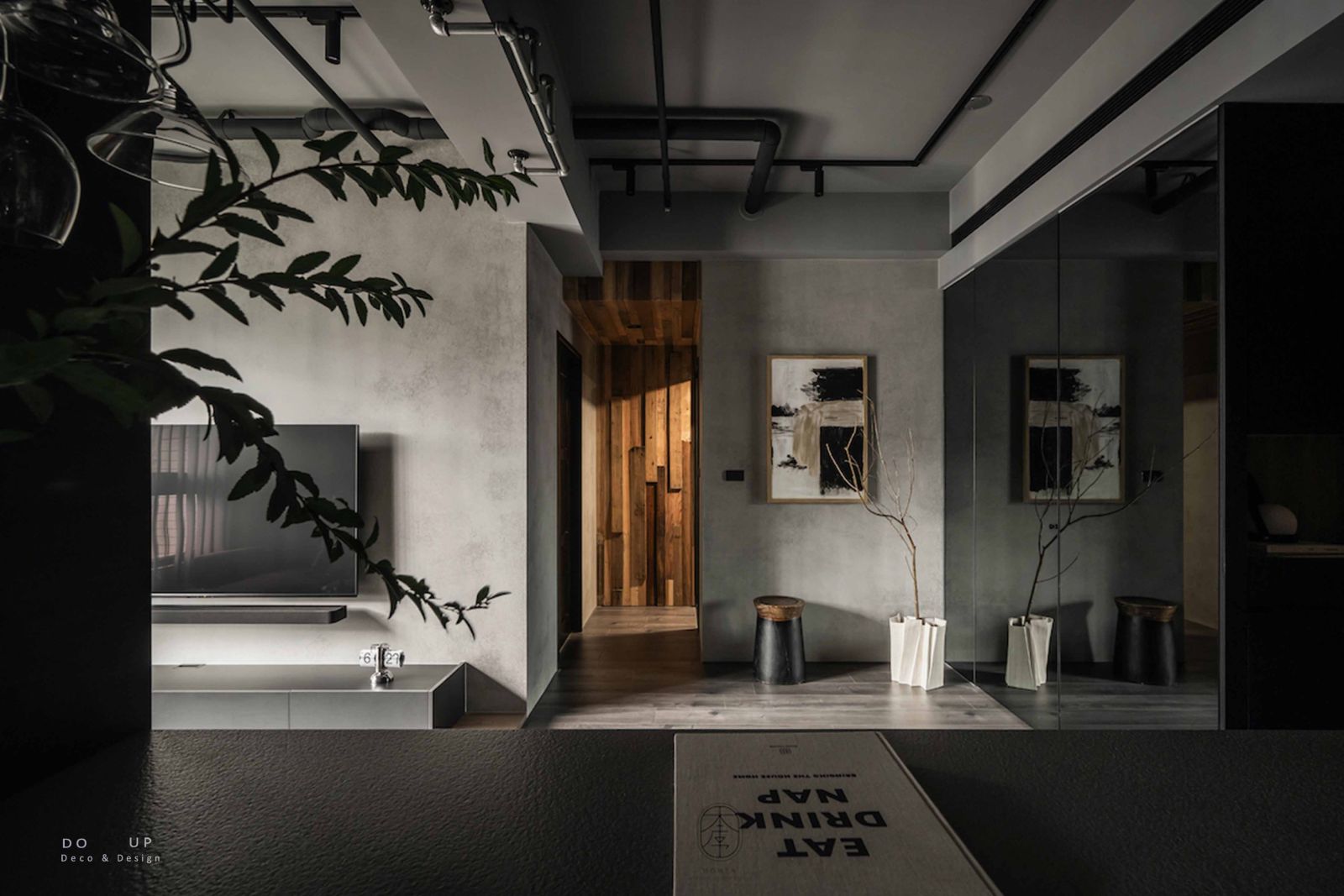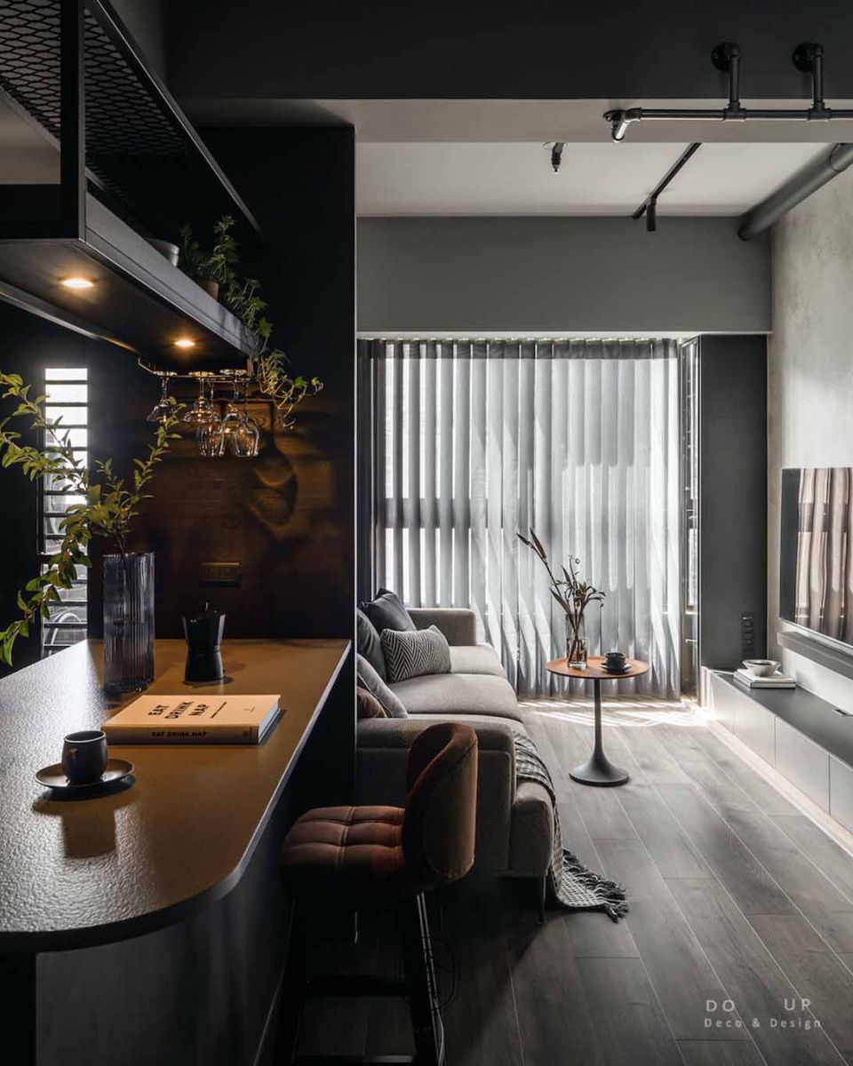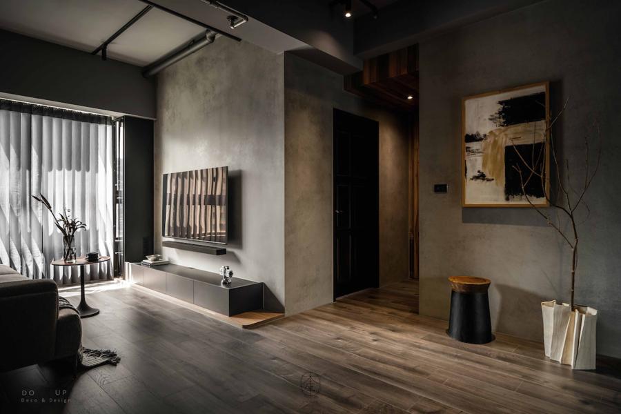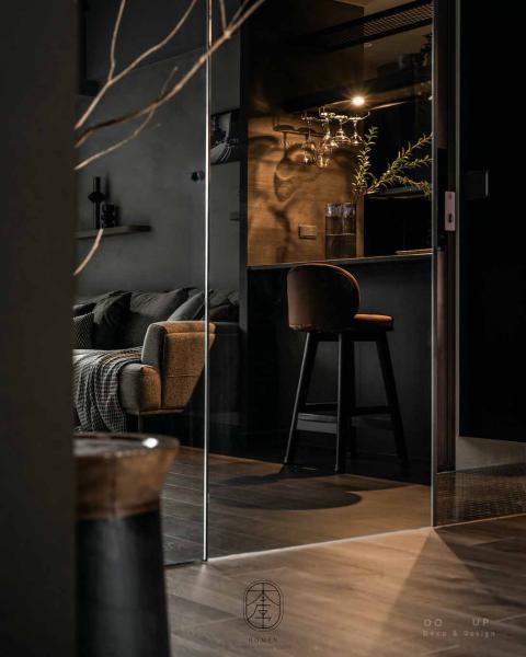 電視牆側邊的原木層板架上,軟裝師僅點綴了幾只線條純粹的黑色幾何陶瓶,在間接照明的映照下,投射出充滿藝術感的陰影細節。邊几上則擺放了一瓶自然延伸的蘆葦花藝,其枯寂而優雅的姿態,完美呼應了設計師想傳達的沈穩療癒氛圍。這場由 DO UP 的空間陳列擺拍,讓客廳不再只是一個機能場域,而是一個能讓思緒徹底安放的深色私藏館。