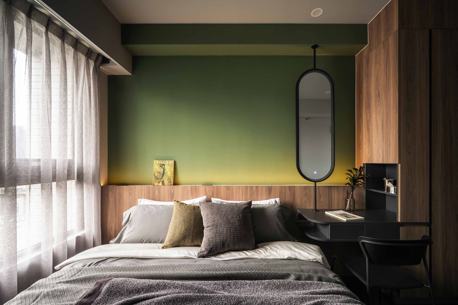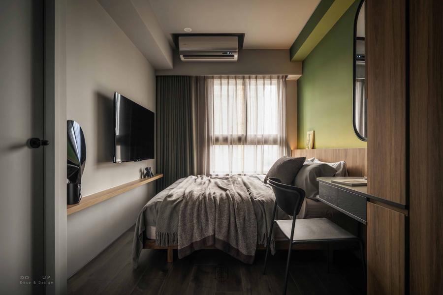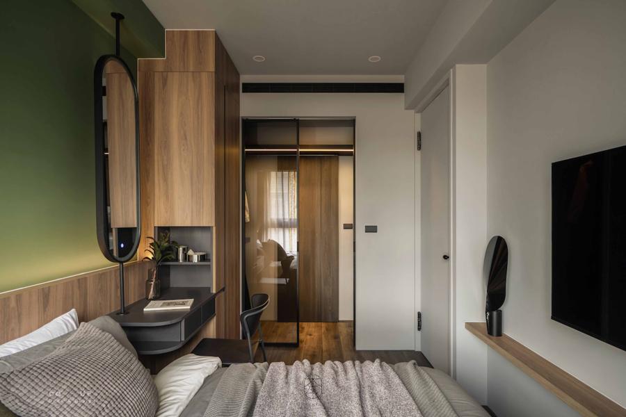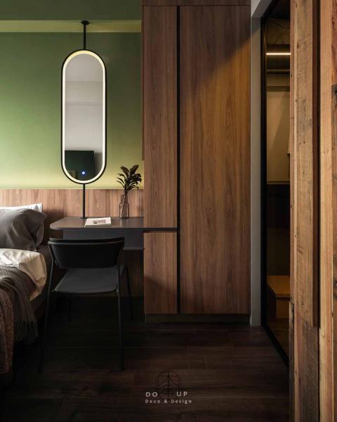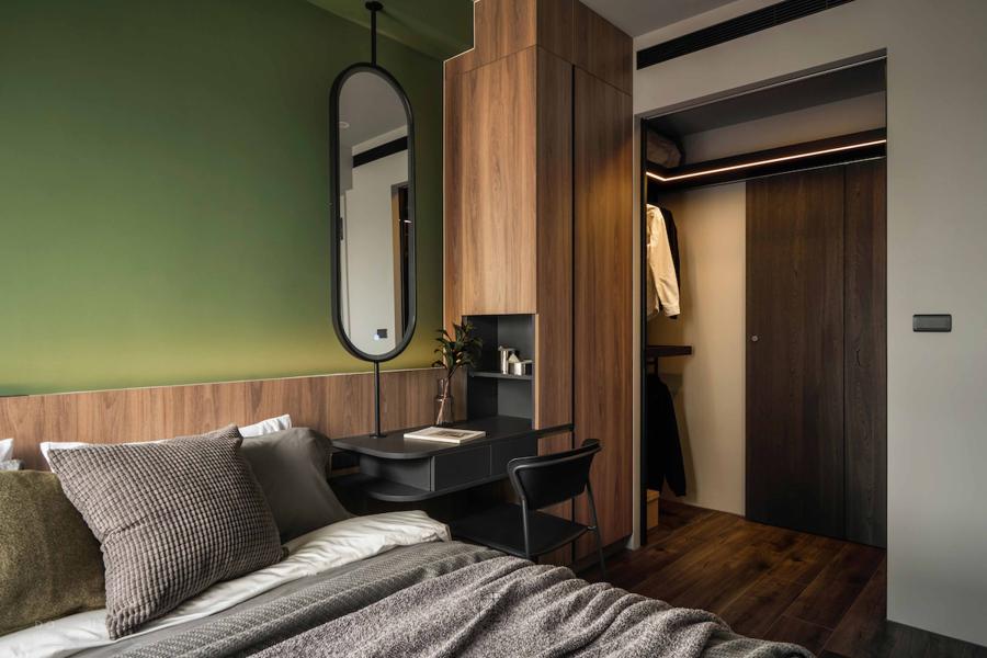 步入主臥室,一場大膽的色塊實驗正悄悄上演。設計師捨棄了傳統的淺色系,改以充滿自然氣息的橄欖綠牆面作為視覺核心,搭配深邃的胡桃木皮收納櫃,營造出一種如同置身森林木屋般的靜謐睡眠氛圍。牆面下方埋入的層板燈與間接照明,讓光線不再直射,而是柔和地在橄欖綠的肌理上暈開,勾勒出深沉且安穩的療癒感。