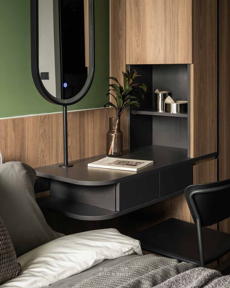 在坪數的運用上,室內設計師展現了極致的機能整合功力。床頭側邊巧妙嵌入了懸浮式化妝台,並與大容量的木質衣櫃一體化設計,在維持動線流暢的同時,更滿足了高度的實用需求。軟裝師在此處配置了一面造型洗鍊的長圓形發光鏡,搭配一盞極簡黑色單椅,讓晨間的梳妝也成了一種充滿儀式感的生活享受。主、未完待續的生活詩篇。