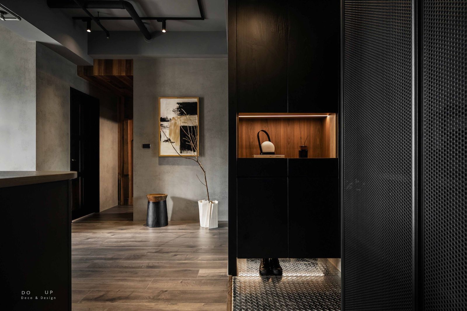 DO U在玄關轉角處安置了一幅具備流動張力的抽象藝術畫作與造型別緻的黑木色圓凳。為了替冷調空間注入生命力,用純白花器中點綴了一株自然延伸的枯枝花藝,透過大面積鏡面的映照,讓視覺層次得以無限延伸,將平凡的過道昇華為一處值得駐足的微型藝廊。