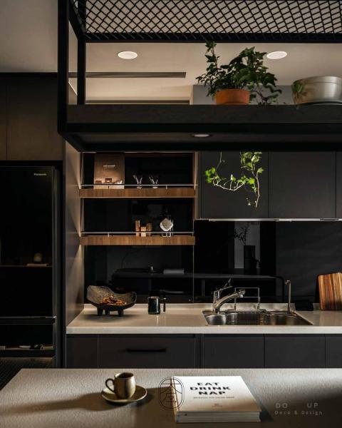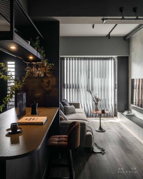 轉入吧台餐區,深色的開放式中島與電視牆一脈相承,設計師規劃的黑色擴張網吊架不僅具備機能,更勾勒出俐落的工業線條。軟裝師在此處選用了一張具備質感皮革紋理的焦糖色高腳吧台椅,在深沉的黑色基調中點燃一抹視覺亮點。