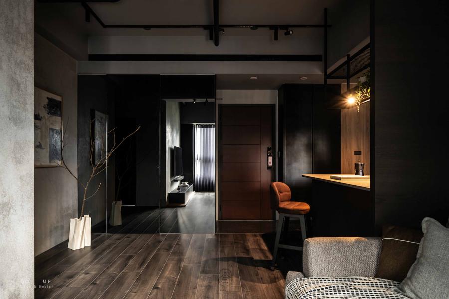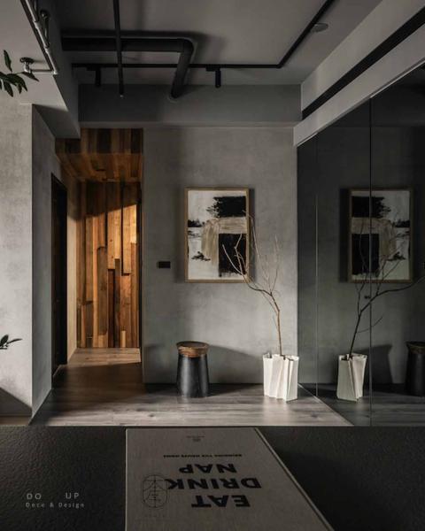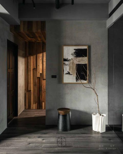 家的儀式感由玄關的第一步開啟,室內設計師利用金屬防滑板地坪銜接室內深色木地板,冷冽與溫潤的碰撞界定了出場域的分野。最迷人的風景莫過於走道盡頭那一抹由實木拼貼構成的溫暖端景,與牆面上大面積的灰階水泥肌理相互映襯。