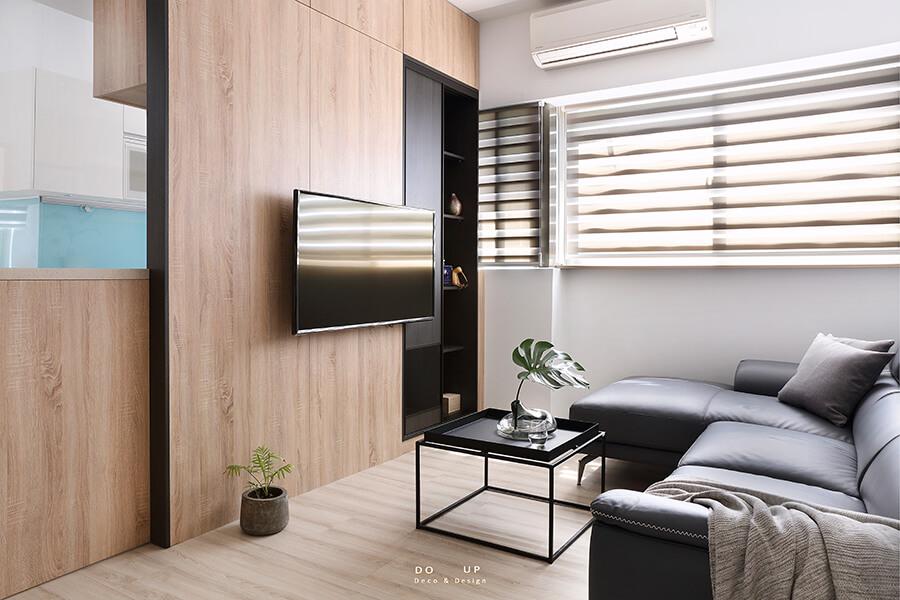 前陣子為寬象所設計的東湖宅邸佈置,小空間內運用電視牆區分廚房與客廳,而屋主選用了深灰色沙發作為客廳的主角,因此我們挑選了以黑色俐落方體造型的茶几、灰色調毯子、些微金屬色擺飾突顯空間中的內斂感。