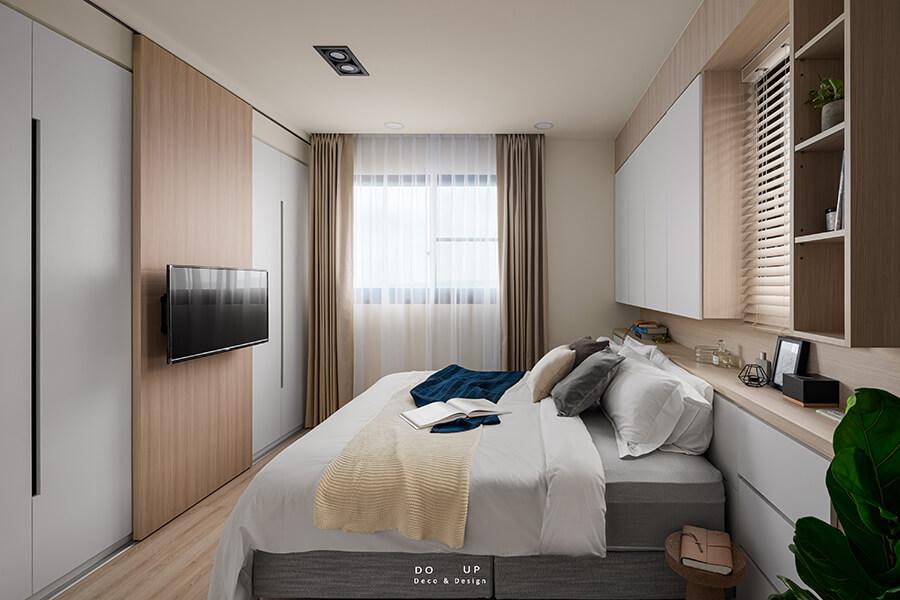 主臥室的部分延續了客廳的風格,木地板和整體的木製系統櫃,舒服的氛圍讓人放鬆。我們用不同的淺色抱枕和毯子增加床的豐富度,再用深藍色的蓋毯讓整個層次拉出來。用落地植物讓主臥多了一股綠意,整體飾品也選用了許多香氛和相框,讓主臥的氛圍能更為明顯。