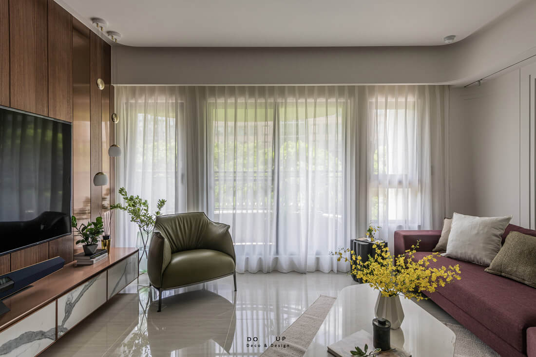 今天的空間擺拍,位於內湖的森濤院。空間設計為全白的現代輕奢風格,加入了古典的元素在裡頭。室內設計師特別選用酒紅色的沙發提升空間的氛圍和質感。