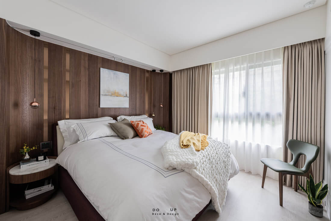 核桃木色系的床頭牆,搭配上古銅的吊燈。我們用淺色系的畫作和跳色抱枕去裝飾,亮黃色的毯子也提升了整個空間的活潑性。