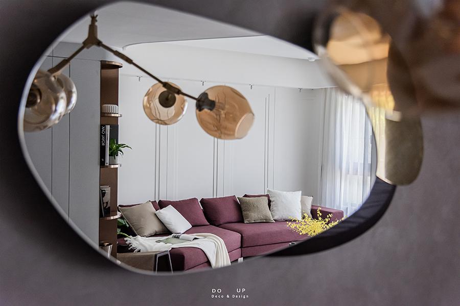 金屬球型吊燈和不規則形掛鏡,點綴了用餐區的質感和氛圍。