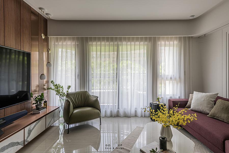 「輕奢現代風格,酒紅色沙發點綴空間。」