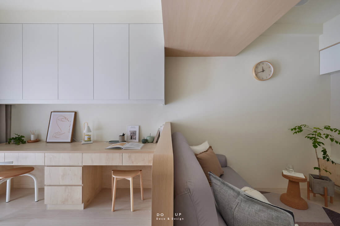 位在新北市的空間擺拍案,屋主是一對年輕夫妻和九個月大的小寶寶。原先建商的設計是三室一廳,室內設計師將其更改為兩室一廳的格局,目的是將光線引入住宅空間中。以木頭背板區隔出客廳和書房兩個區域,因坪數限制的關係,並沒有特別區隔出用餐區域。因此書房的空間也不僅限單一功能,可以用餐、工作,也可以在此泡一壺茶,靜靜地翻閱書本,度過悠閒陽光的午後。