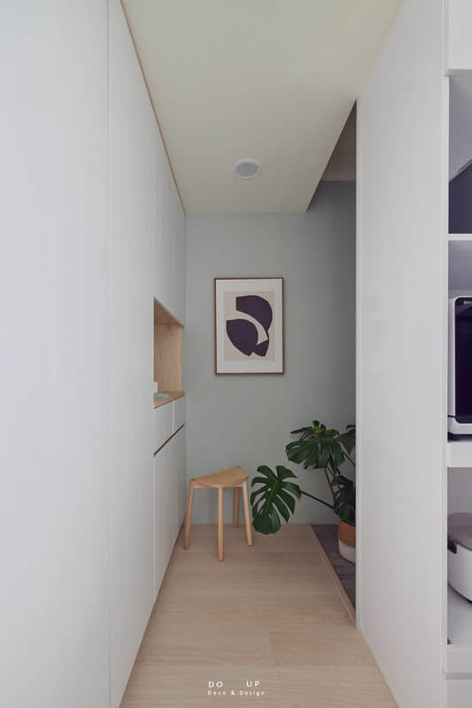 從玄關入走入,大面的白色櫃體一路延伸,在櫃體中保留一個空格作為收納鑰匙等外出必需品的位置。白色櫃體和木紋的組合,不僅簡單好看,收納性更是不容小覷。軟裝設計的部分,以畫作成為視覺焦點,小椅凳及植栽來增添層次。