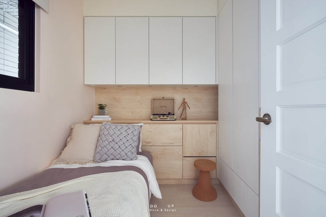 轉身進入臥房空間,同樣使用白色及木紋櫃設計的收納空間及床架,不浪費一點旯旮,在小小的空間中備齊足夠的收納空間!軟裝設計師運用床包織品改造整體空間風格,原色系的棉麻披毯以及同樣材質的抱枕,屬於棉織品細緻紋理更能體現材質的溫度。