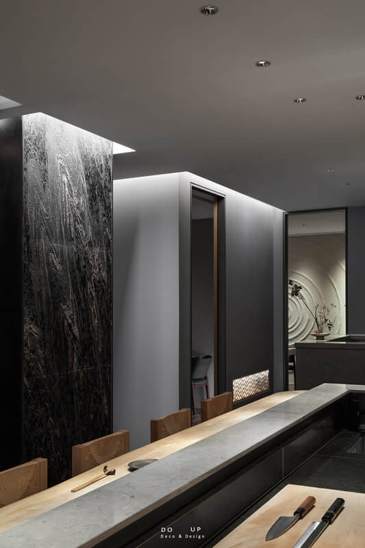 不同材質的語彙,交流出低調溫潤的空間風格。用自然岩石的樣貌,流露出最原始的樣貌,有時候「自然原始」雖並不完美,但卻是真實而有溫度的。展現日本「禪」及「侘寂」的精神。